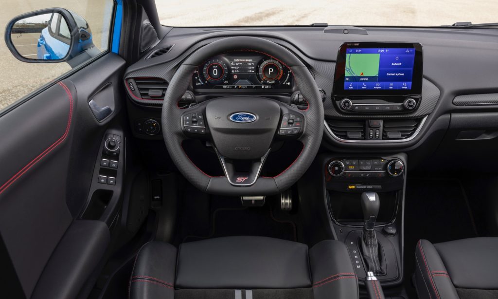 Indítás után pontosan olyan morgós hangon szólal meg az automata ST háromhengerese is, de itt már csak 1,0 liter zengeti a dupla csőben végződő kipufogórendszert. Sportmódban ez is megnyitja a szelepet, hogy testesebb hangja legyen. Ahelyett, hogy a kuplung kinyomása után egyesbe szúrnám a váltót, itt már csak a féken állva D-be húzom a hétfokozatú duplakuplungos automata karját. Nincs benne semmi analóg rituálé, zongorázás a három pedálon, a kuplung felengedése és a gázadás harmóniája, csak leszállok a fékről, és lassan kúszik a Puma ST.