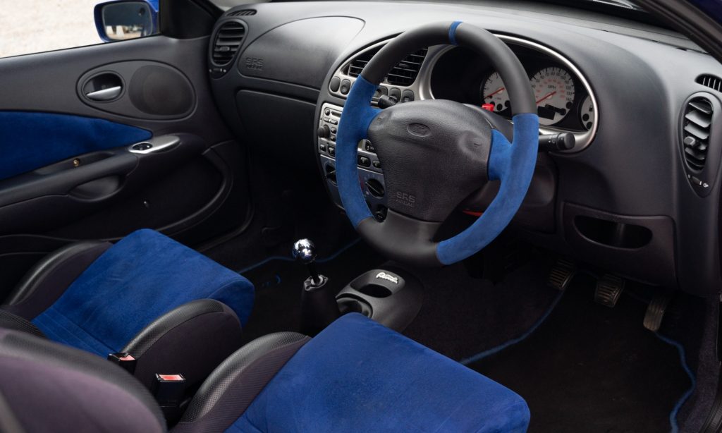 Sparco kagylóülésekkel és kék alcantarával behúzott háromküllős kormánnyal az utastere is sportos.