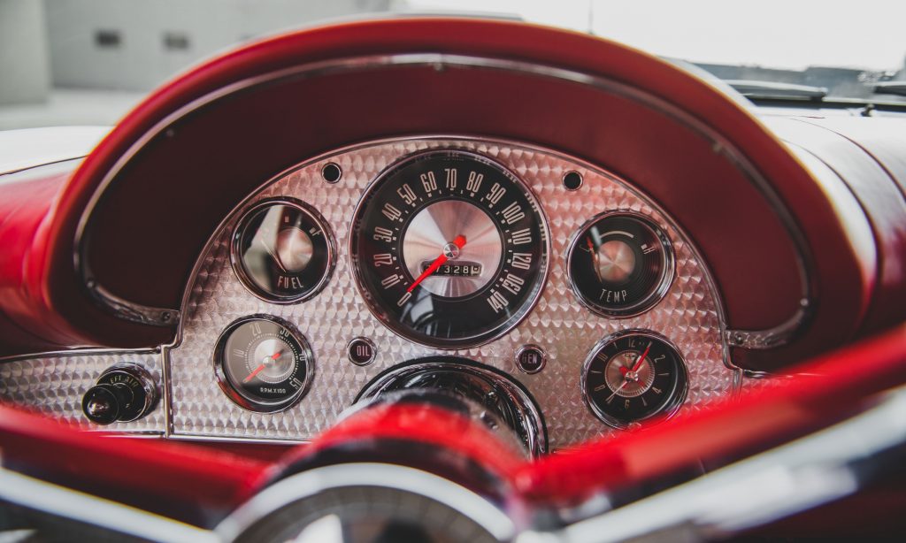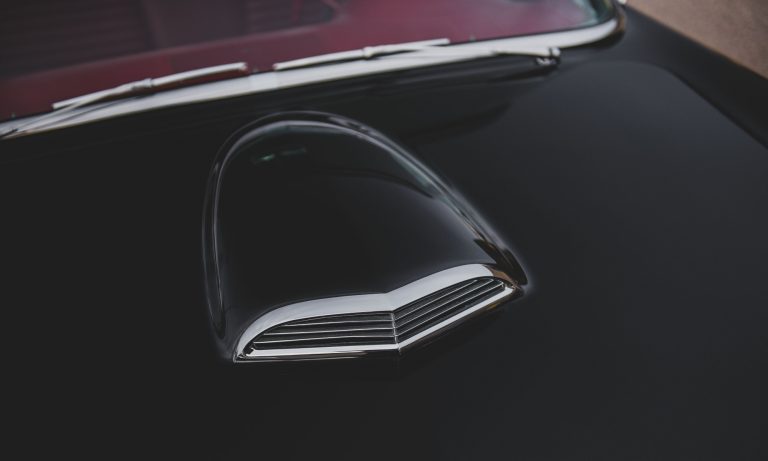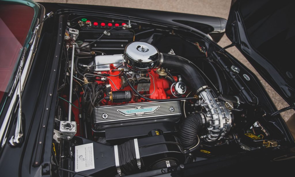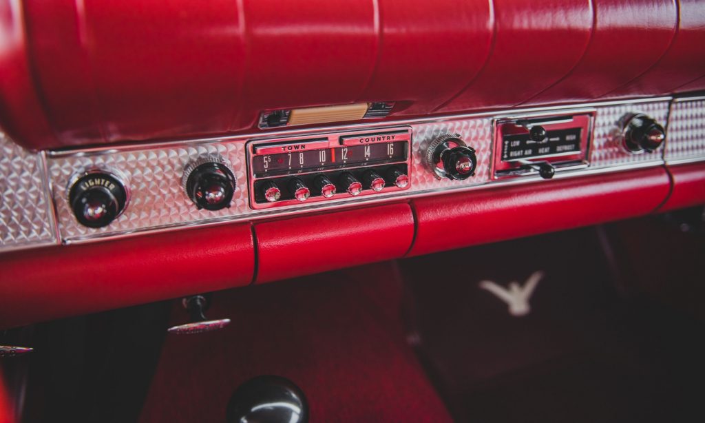 Ez az autó viszont a maga letisztult módján elég baljós kombináció. A hollófekete fényezéshez szitán fekete kerekek jártak, mellé pedig piros műbőr belsőt választottak, mellyel úgy néz ki, mintha valami főgonosz autója volna. Rendeltek hozzá háromfokozatú, overdrive-os kézi váltót, színezett üvegeket és jelkereső rádiót. Nem kértek vászontetőt a Kaliforniába szállított autóhoz, mert megette volna az erős napfény, csak színben passzoló, levehető keménytető van hozzá, ezért nem árt megnézni az időjárásjelentést indulás előtt.