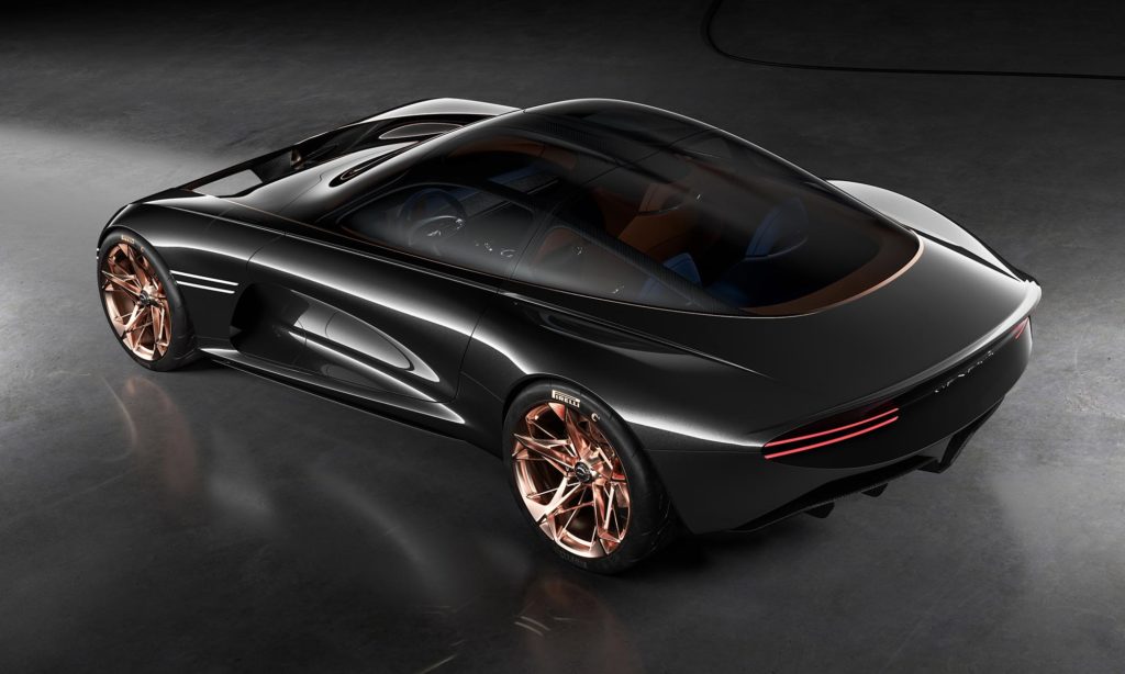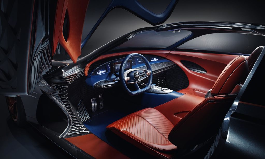 A karcsú karosszérián kívül az utastér is figyelemreméltó, amit felfelé nyíló ajtókon át lehet megközelíteni. A prototípus tisztán elektromos hajtású, és mivel az akkumulátort nem a padlóban, hanem az ülések közti alagútban helyezték el, ezért az üléseket és a tetőt is alacsonyabbra építhették a 2+2 üléses túrakocsiban.