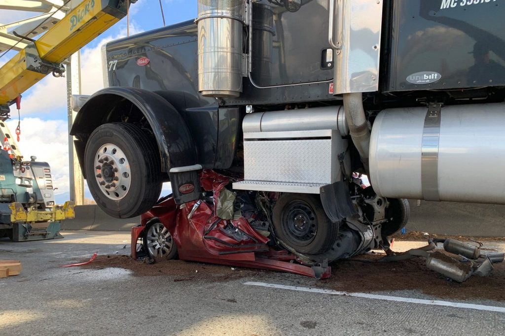 There’s really not a word to describe this collision. Miraculously believed to be minor injuries. The car was struck from behind, folded the car in half, and semi came to rest on top of the car. In my 14 year career, I have never seen anything like it. https://t.co/iUsSNIhHYV pic.twitter.com/EPGI70s3Um