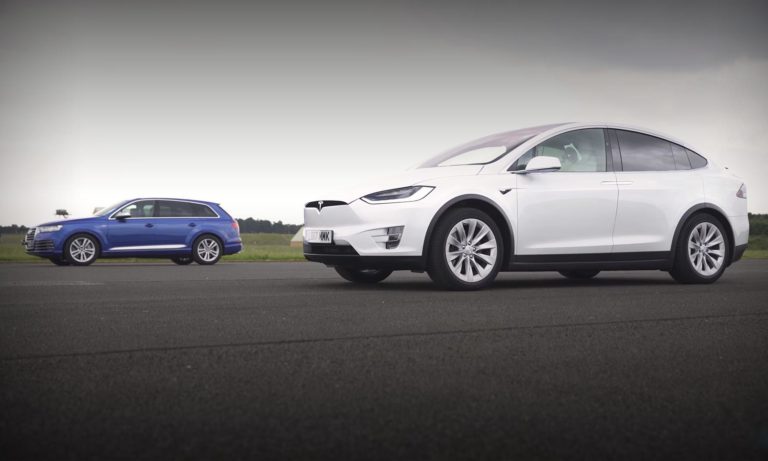 A videó főszereplője az Audi SQ7, aminek 4 literes biturbó V8-as dízelmotorja 435 lóerőre képes, és brutális, 900 Nm nyomatéka már ezres fordulatszámtól rendelkezésre áll. Egy éve kiderült, hogy ez mire elég egy Tesla Model X ellen: