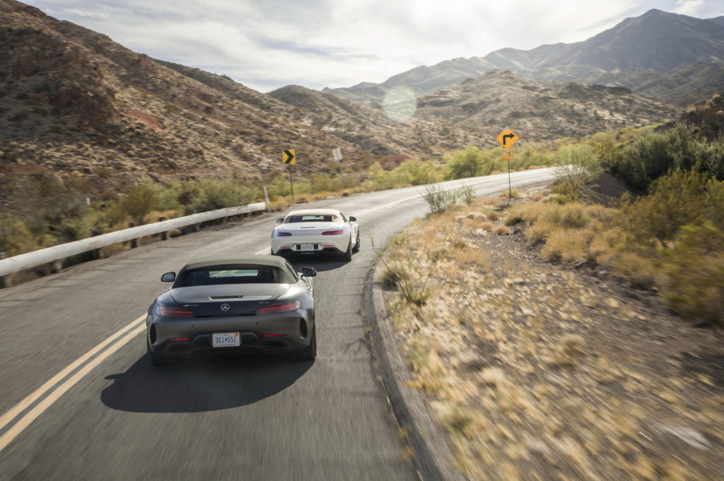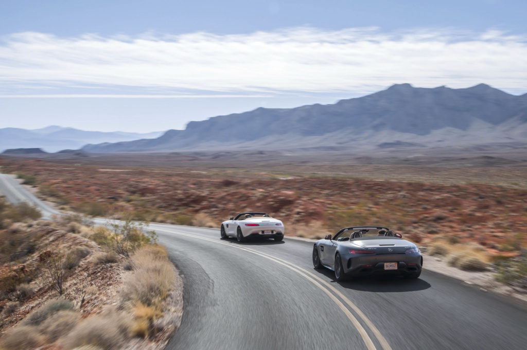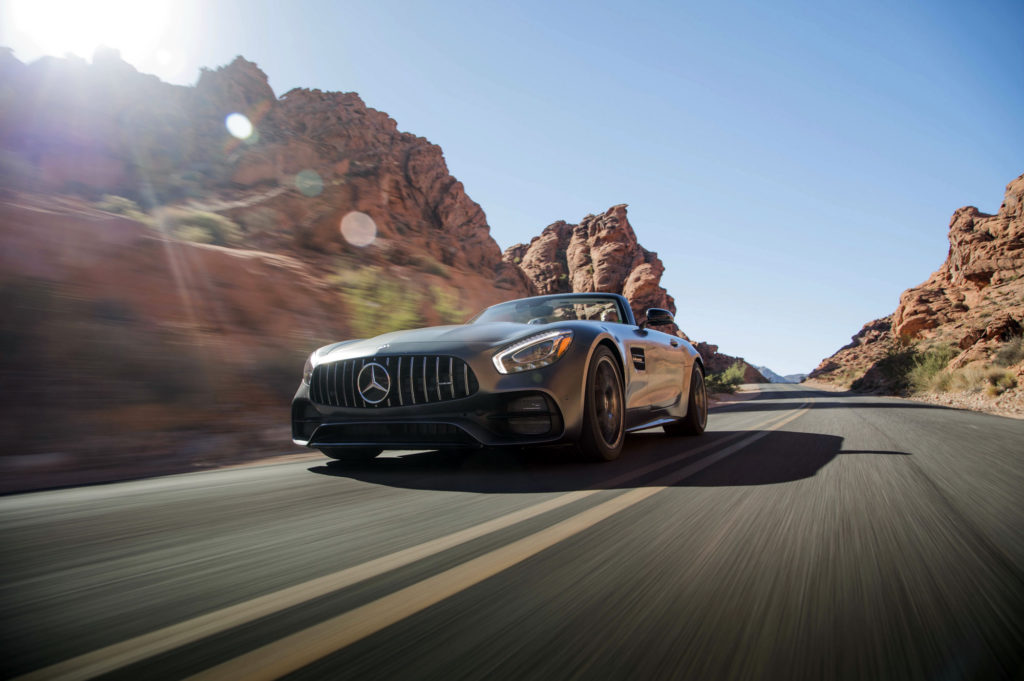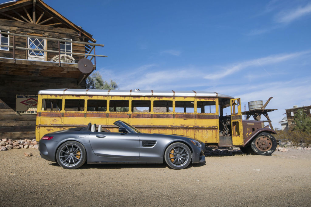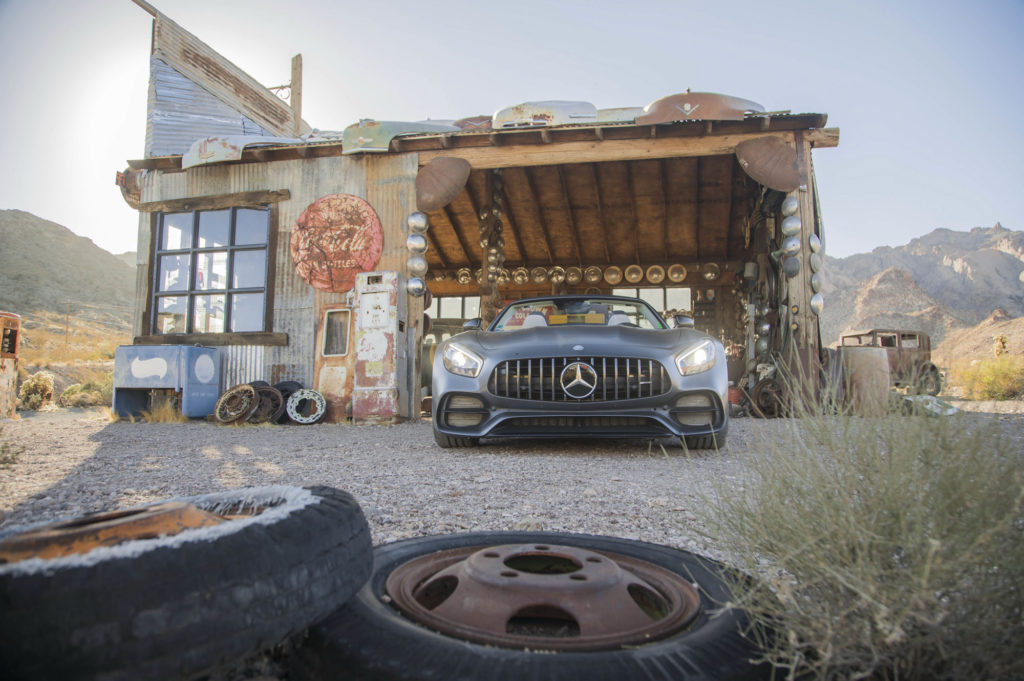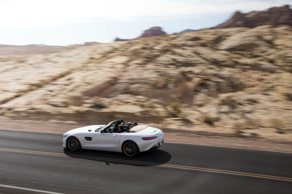 A végtelenbe nyúló amerikai országutakon készültek az AMG GT vászontetős változatának képei, a sajátos hangulatú fotókon pedig nemcsak az autó, hanem a környezete is lenyűgöző.