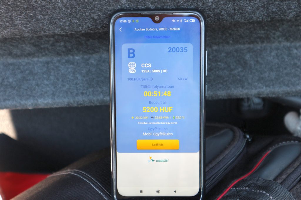 Kevesebb mint egy óra alatt sikerült 5200 forintért betankolnom kb. 120-140 kilométerre elég energiát. Ez azt jelenti, hogy körülbelül egy V6-os turbós benzinmotor fogyasztásának megfelelő pénzért töltöttem kilométerarányosan a kocsit, nettó 20-szor, de a korábbi bolyongásokkal együtt inkább 40-szer annyi ideig, mint amennyi egy klasszikus benzines teletankoláshoz kell.