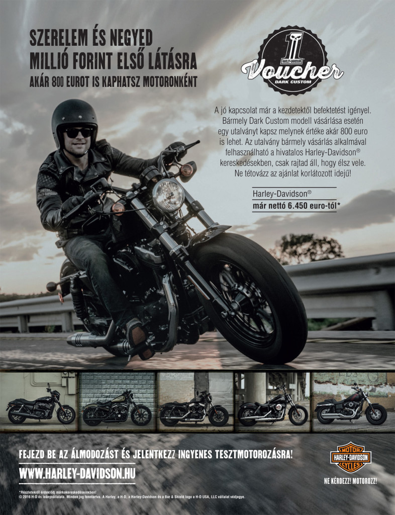 A Harley-Davidson olyan tavaszi kampányt indított, ami mellett nehéz elmenni szó nélkül. Első körben az fogott meg minket, hogy tesztvezetés. Ki lehet próbálni a szerelmet. Különösebb elköteleződés, nagy szavak és ígéretek nélkül megpróbálhatsz felépíteni egy kapcsolatot a szabadsággal. A Dark Custom modellek most egészen korrekt körülmények között keresik gazdáikat. Ezekről beszélünk, drága barátaink: