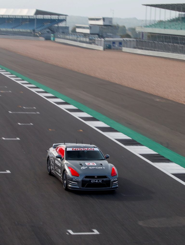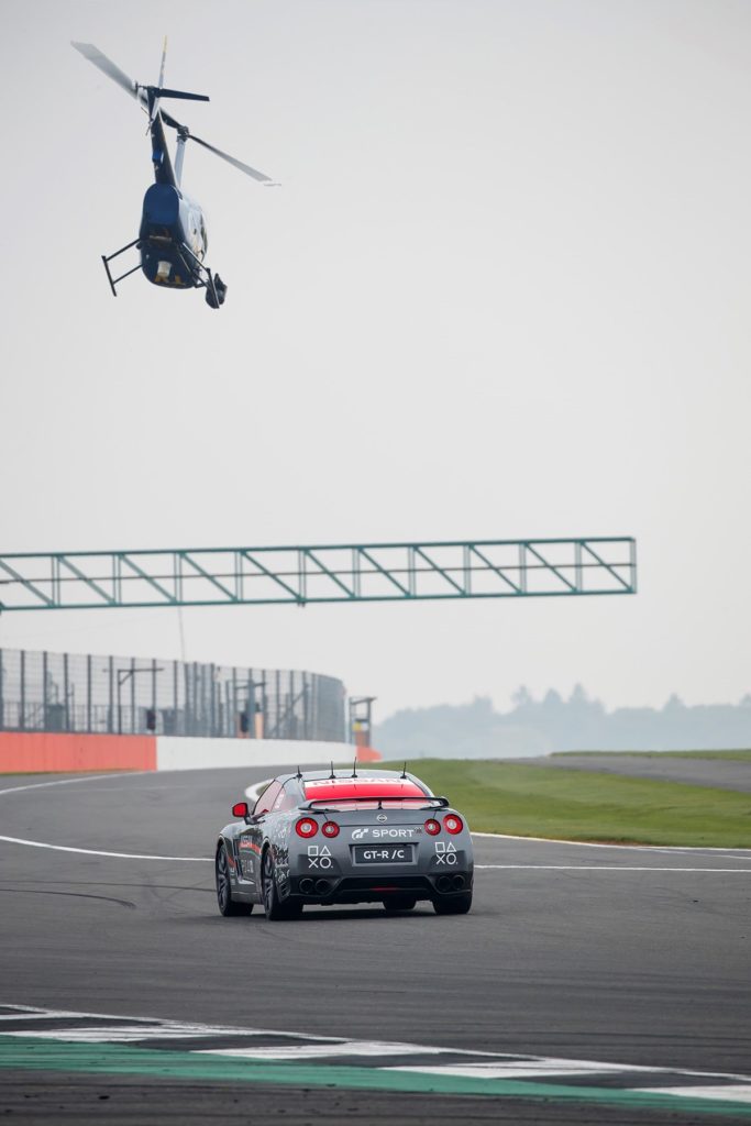 Jann pedig rögtön a silverstone-i pályán próbálhatta ki a gépet, méghozzá egy Robinson R44 Raven II helikopterből, ami erre az alkalomra külön engedélyt kapott az alacsony magasságú repüléshez. Nem spórolt a tempóval, hiszen az egyenesben 211 km/órát ért el úgy, hogy csak felülről látta a GT-R/C névre keresztelt prototípust. 1 perc 17,47 másodperces köridejével 122 km/órás átlagot ért el a 2,6 kilométeres rövid pályán.