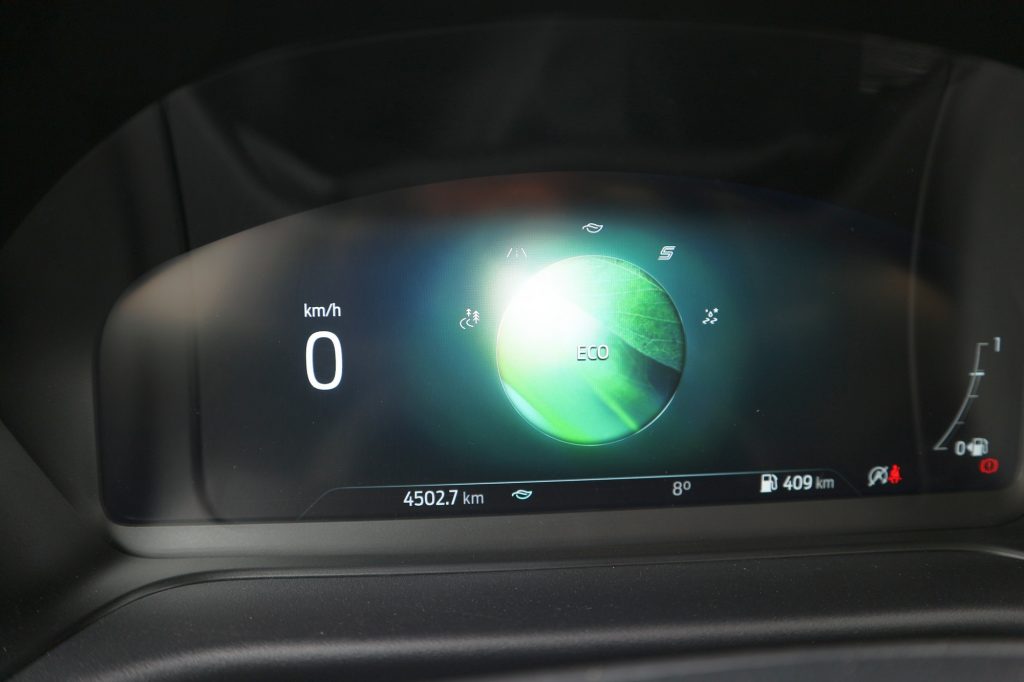 Belül már jóval visszafogottabb a stílus; nyilván majd az ST-verzióban jön a lapított kormány és a kagylóülés. Itt, ebben az alaposan felextrázott komfort-változatban más dolgok miatt esik le az ember álla. A virtuális műszeregység és a szép, kontrasztos, erős fényű képet adó főképernyő 2020-ban már nem nyűgöz le senkit, de a porózus, antik hatású fabetét, az ízléssel adagolt bőrök és fémek, a jó minőségű műanyagok olyan prémiumhangulatot teremtenek, amit megint csak nem vártunk volna egy tömegmodelltől.