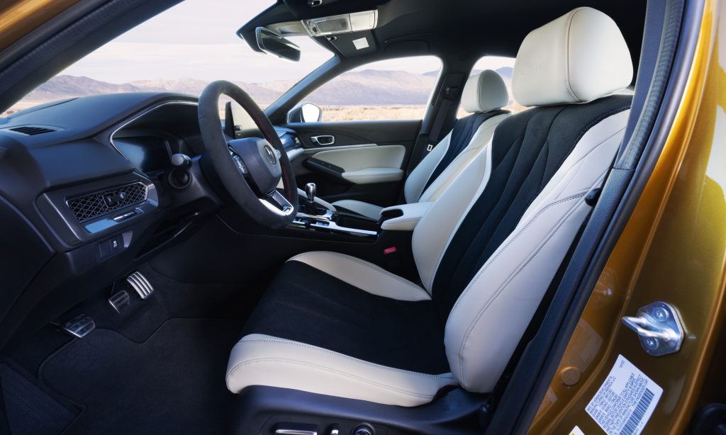 Utasterében feltűnő elem az alcantara karimás, háromküllős sportkormány és a határozott oldaltartású első ülések, de a Civic Type R-rel ellentétben itt nincs ordító piros kárpitozás. A vezető előtti 10,2 colos képernyőn jelenik meg a digitális óracsoport, a központi érintőkijelző pedig 9 colos átmérőjű és vezeték nélküli Apple CarPlay és Android Auto telefontükrözést tud.