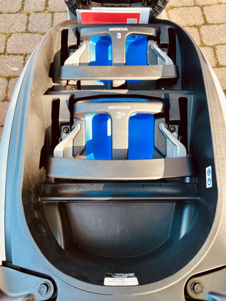 A motort két darab, 50,3 voltos, 1,3 kW-os Honda Mobile Power Pack e: akkumulátorral szerelték fel, ennek darabja 10 kilót tesz ki, és nagyjából három másodperc alatt kiránthatjuk a motor gyomrából, ennek viszont az is az ára, hogy gyakorlatilag semmi hely nincs az ülés alatt. Érdemes tehát tárolódobozt vásárolni hozzá, ha összekötjük az életünket, ezt 35 és 45 literes méretekben is megtehetjük.