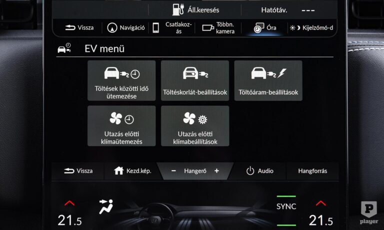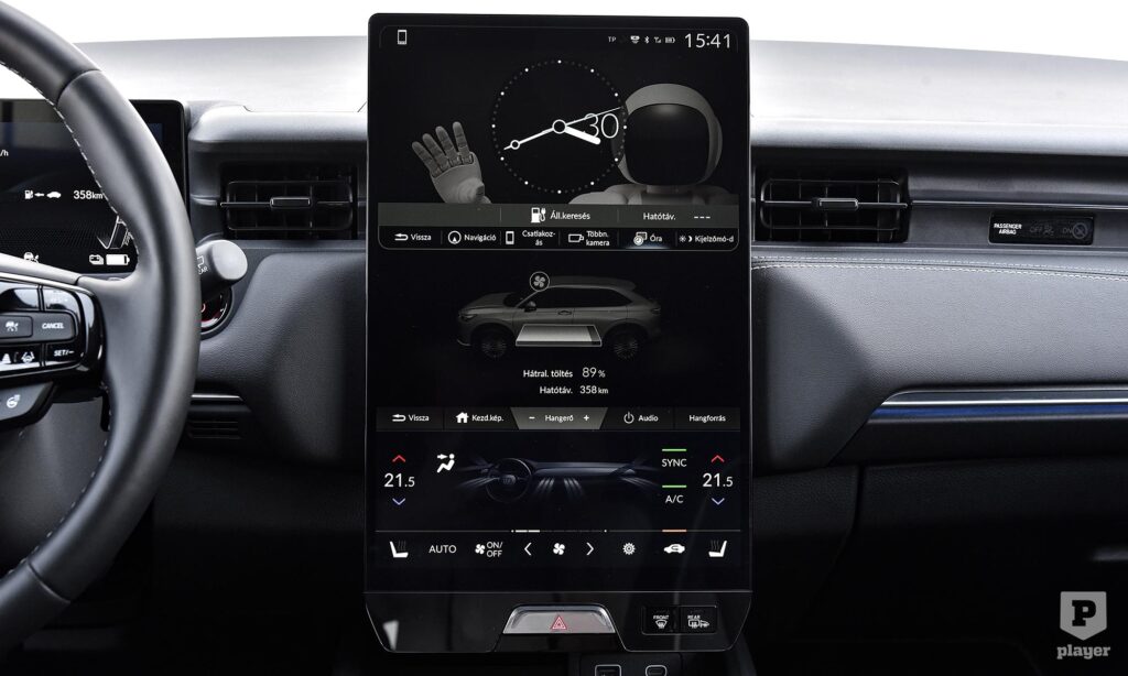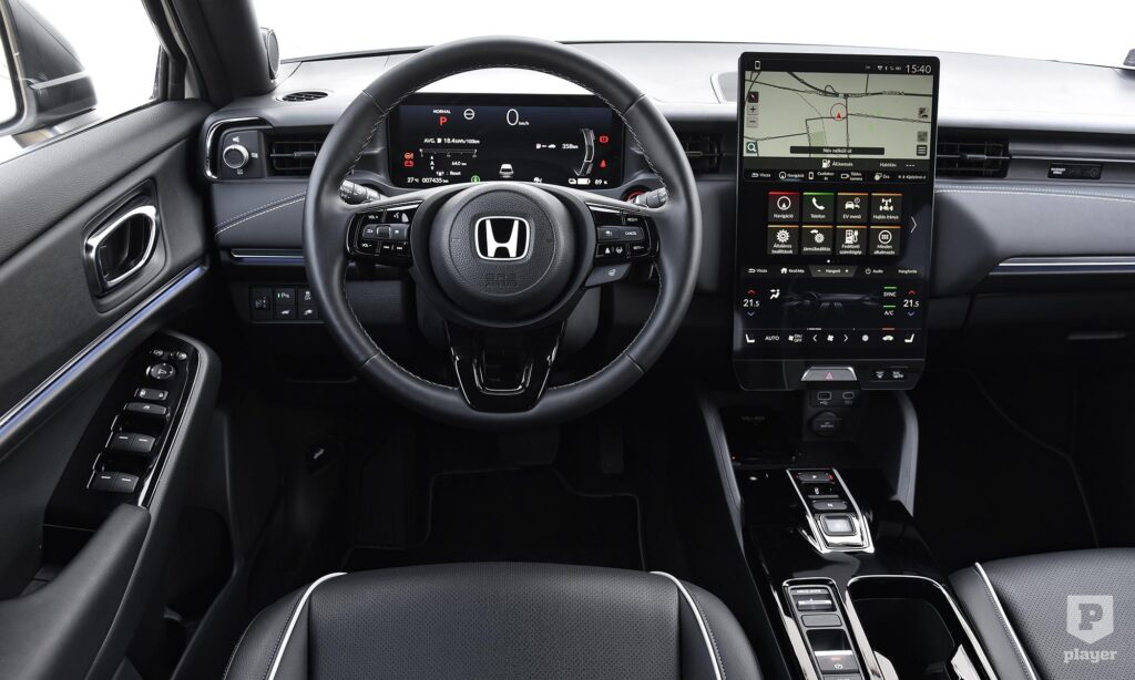 Aki a hatalmas kijelzőt részesíti előnyben a hagyományos kapcsolókkal szemben, annak biztosan bejön, hogy az elektromos Honda 15 colos álló képernyőjéről kapcsolhatunk mindent, még a fűtés-hűtés gombjai is itt vannak. Az logikus és teljesen jól használható, hogy a képernyő három részre osztott, és dedikált helye van alul a fűtésszabályozásnak. Így sose kell keresni, nem bújik el a menüben.