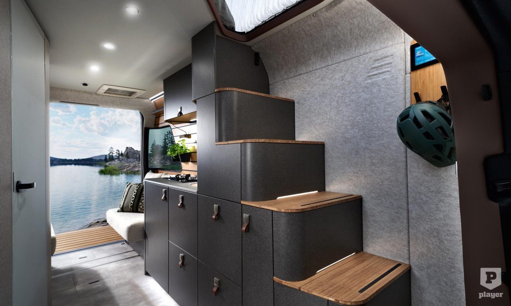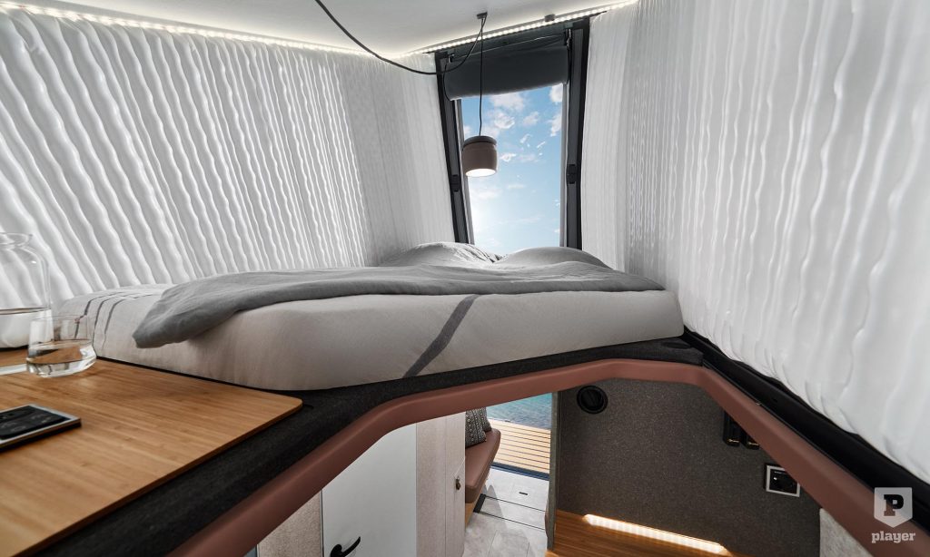 A lakótér érdekessége, hogy a gombnyomásra felemelhető sátras hálószobába nem kell mászni, megvilágított lépcsők vezetnek fel az állítható keménységű matrachoz. A nappalit nagy ablakfelületek teszik világossá,