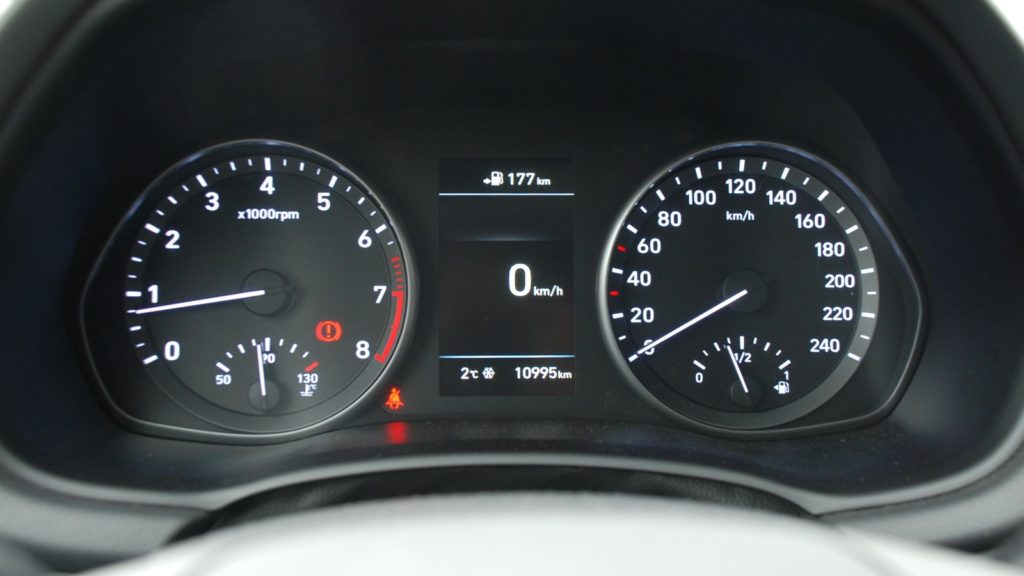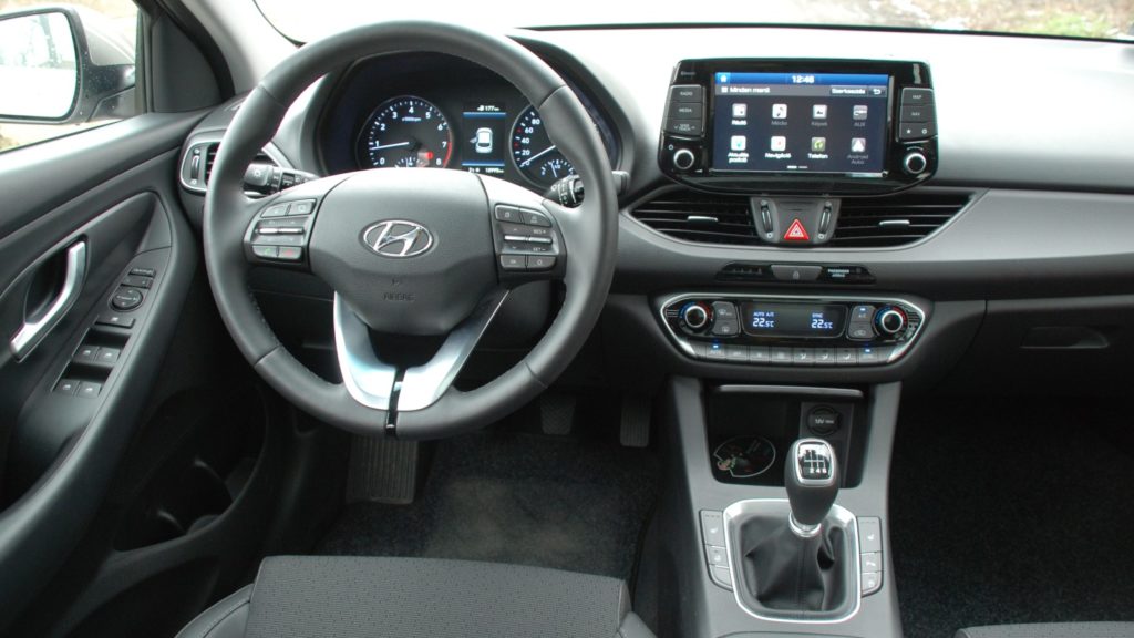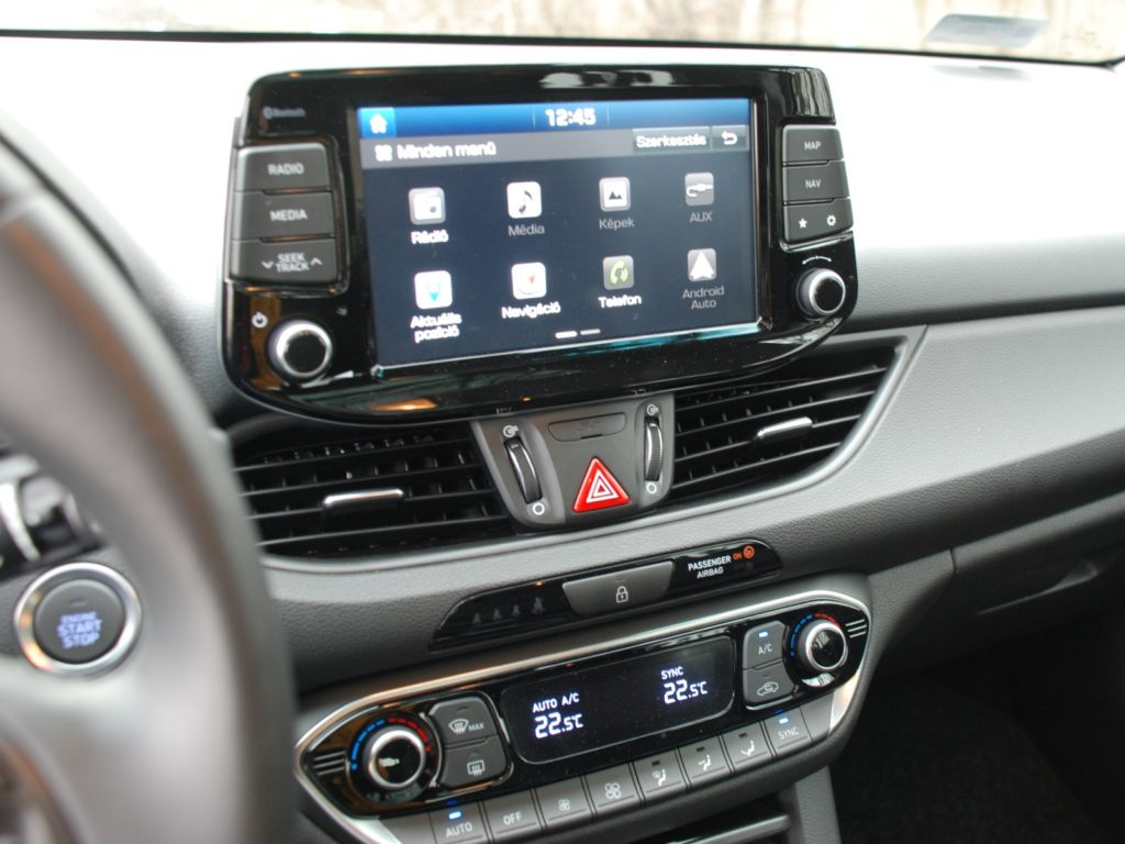 A tervezők ugyan elfeledkeztek róla, manapság nincs kompakt autó monitor nélkül, ezért azt láthatóan utólag biggyesztik a középkonzol fölé azokban az autókban, amelyeknek vevője kifizeti a felárat, de ez furcsamód nem szánalmas, hanem ad egy kis karaktert az egyébként a külsőhöz hasonlóan nem ingerszegény, de nem is letaglózó műszerfalon. Egyébként lebegő érintőképernyőnek hívja a Hyundai, és biztosan van is az a tudatállapot, amikor úgy tűnik.