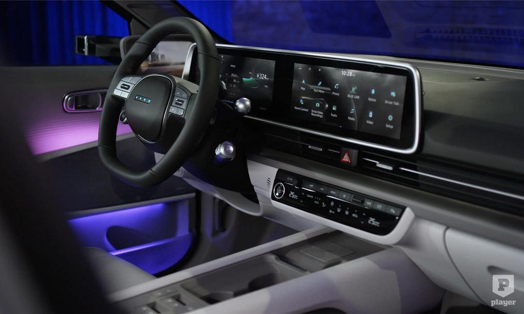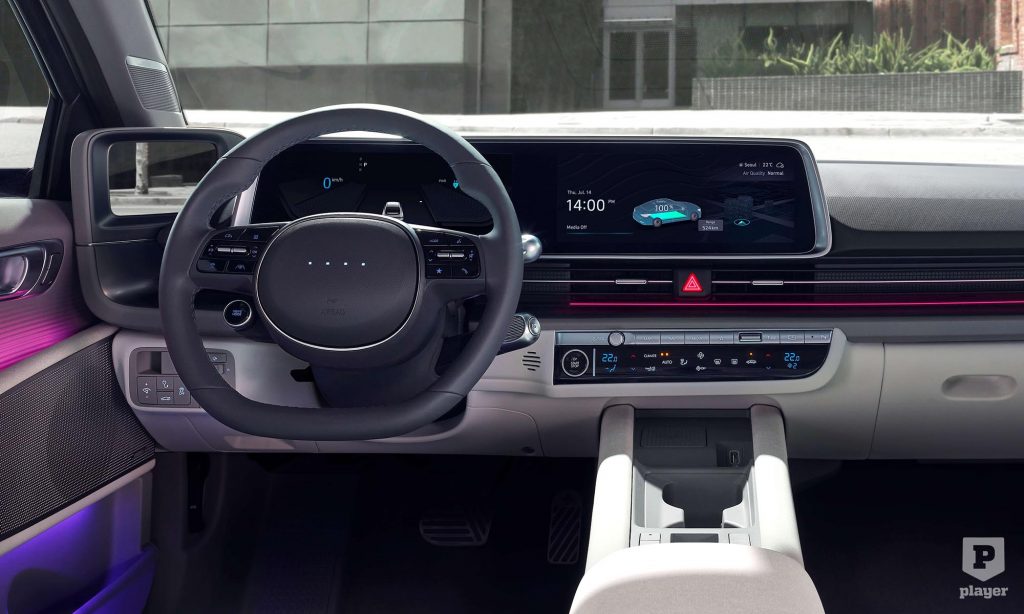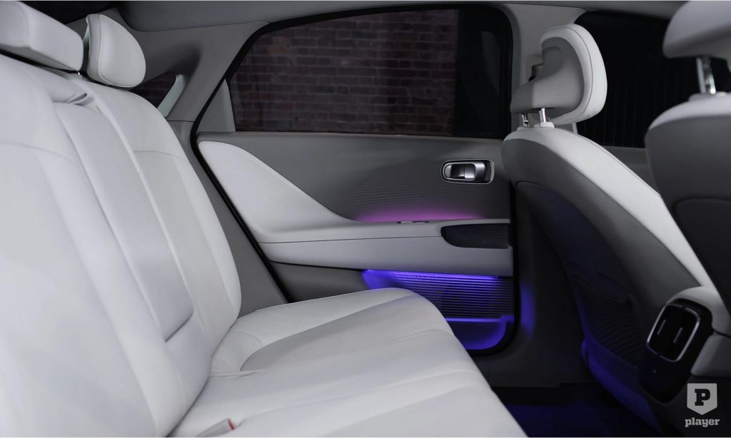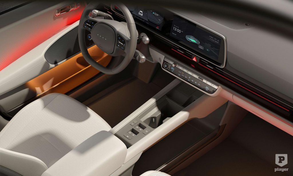 Az utastér berendezése az Ioniq 5-ben látott dizájnt követi, két 12 colos képernyővel, relaxációs módba dönthető ülésekkel és különleges hangulatvilágítással. Az 5-öshöz képest is újdonság, hogy az Ioniq 6-on