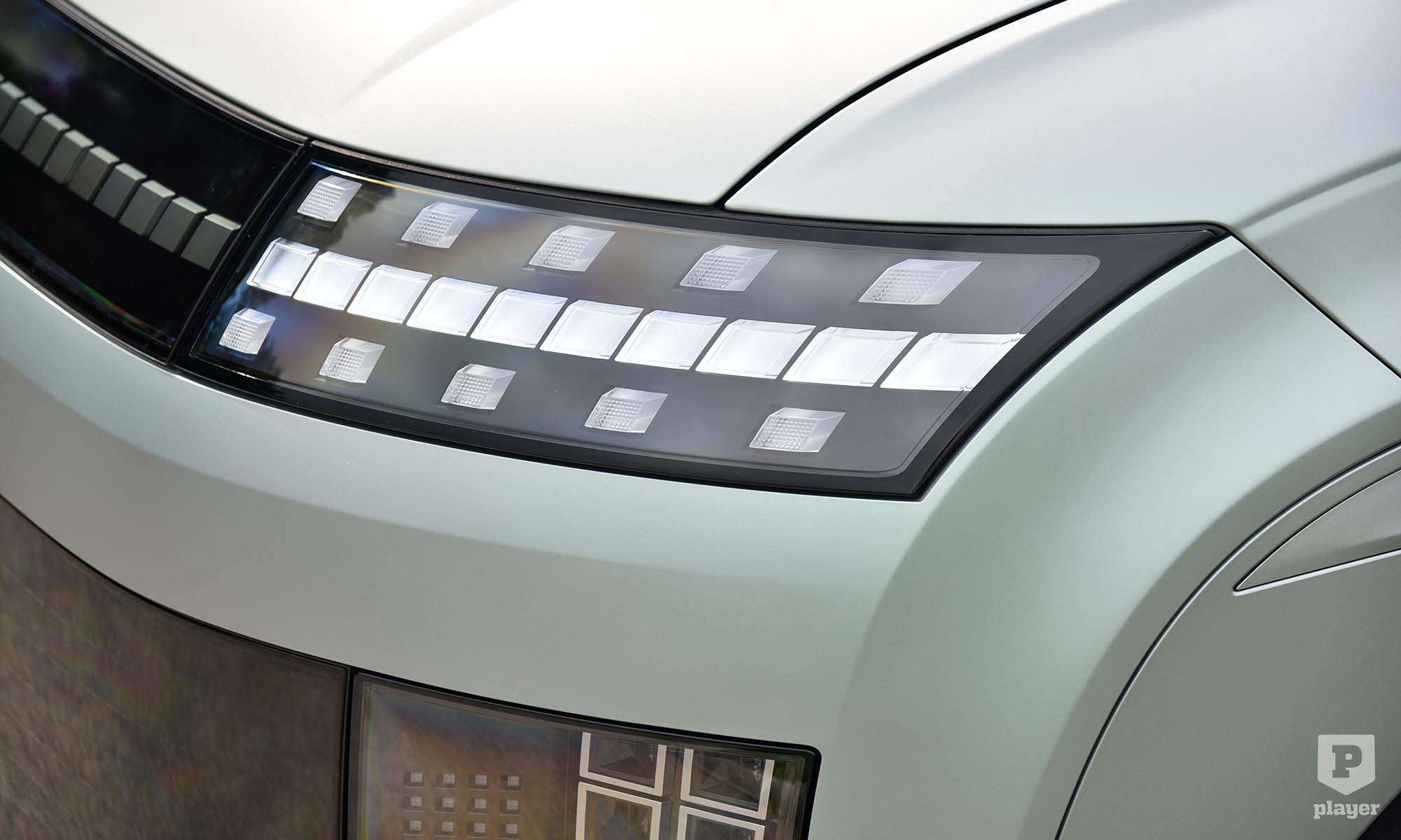 Folytatja az Ioniq 5 és Ioniq 6 parametrikus pixeleit, itt is a nappali fények, a lökhárítóba rejtett fényszórók és a teljes hátulját bekeretező hátsó lámpák világítanak óriási pixelekként. A matt halványzöld autó stílusa sokat merít a Seven koncepcióautóból, amivel ezt a modellt négy éve beharangozták, és a Hyundai minél több részletet átmentett belőle a sorozatgyártásba.