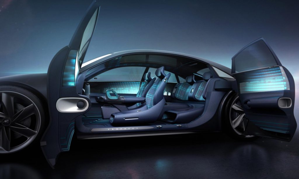 ezek a márkák is az aerodinamikának rendelik alá az autójuk alakját. A Prophecy belső tere már jóval inkább futurisztikus, még kormánykerék sincs benne, és nemcsak azért, mert önvezető lenne: az irányítást két joystickkel oldották meg.