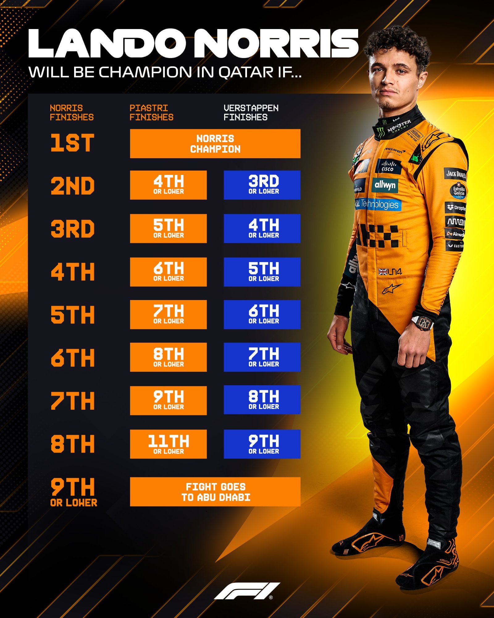 Legalább három ponttal többet kell szereznie, mint Piastri, és ne Verstappen mögött érjen célba. De akár az is elég lehet a bajnoki címhez, ha Piastri és Verstappen egyaránt pont nélkül zár, és ő legalább nyolcadik helyen fut be.