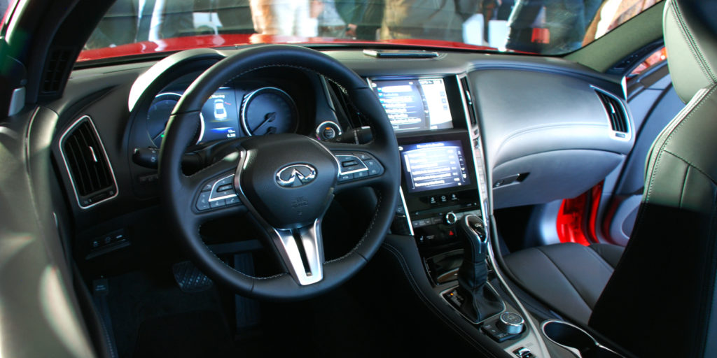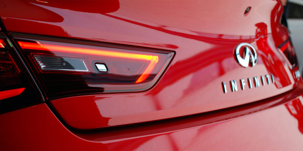 A Nissan prémiummárkája – ha a cégen belüli titkos munkacsoport felállításától számoljuk a történetét – egyébként idén 30 éves, szép ünneplési mód, hogy az eddigi legkívánatosabb kocsijukat mutatták be. A Q60 tényleg vezetésre csábít, nagyon eltalálták a formát, és jófejség, hogy aki nem tudja kitalálni a méretes hűtőmaszk méretes logójáról, hogy milyen autót is látnak, az – a bal hátsó lámpabúrába süllyesztett gombjával nyitható – csomagtérajtón kiírva megtalálják.