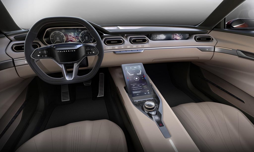 Az Italdesign prototípusa valóban hatalmas, 4,98 méter hosszú, 2,12 méter széles és a tengelytávja is tekintélyes, 2,9 méter. A tágas utastérbe óriási szárnyas ajtókon keresztül lehet beszállni, a belső tér az olasz stúdióhoz illően stílusos.