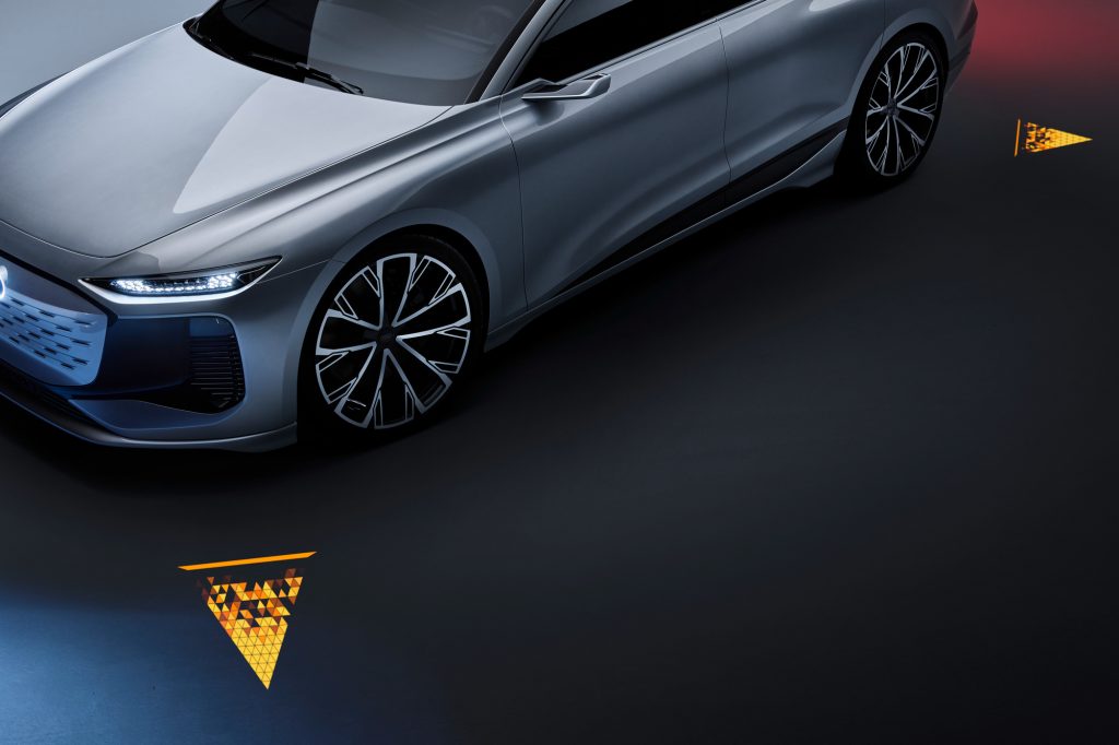 Ami már kevésbé biztos, hogy megmaradhat a sorozatgyártású A6-osokon is: a kocsiba épített projektor. A tanulmányautó ugyanis LED-es és OLED-es fényforrásaival nem csak világítani tud, de különböző vizuális információkat, utasításokat is kivetíthet a kocsi elé vagy mellé. Sőt: az Audi egy videojátékot is készített a koncepcióautóhoz, ami mobiltelefonról játszható, de a kijelző a kocsi előtti fal! Szintén kérdéses, hogy az európai közlekedési hatóságokon átmehet-e majd a hátsó lámpák között világító négy gyönyörű fénykarika - mindenesetre nagyon reméljük, hogy igen!