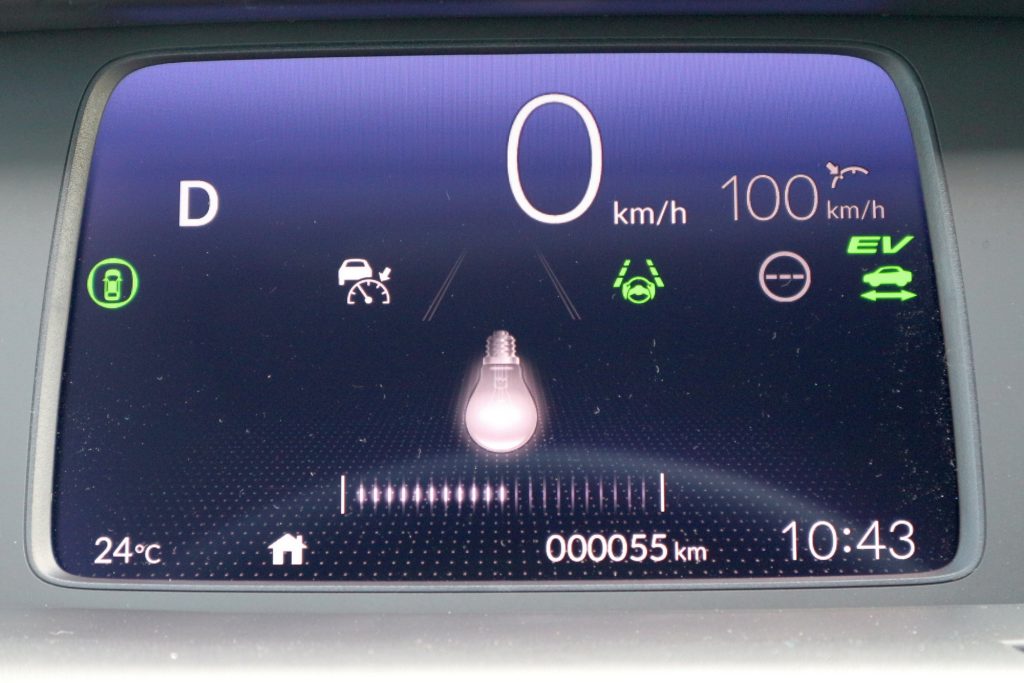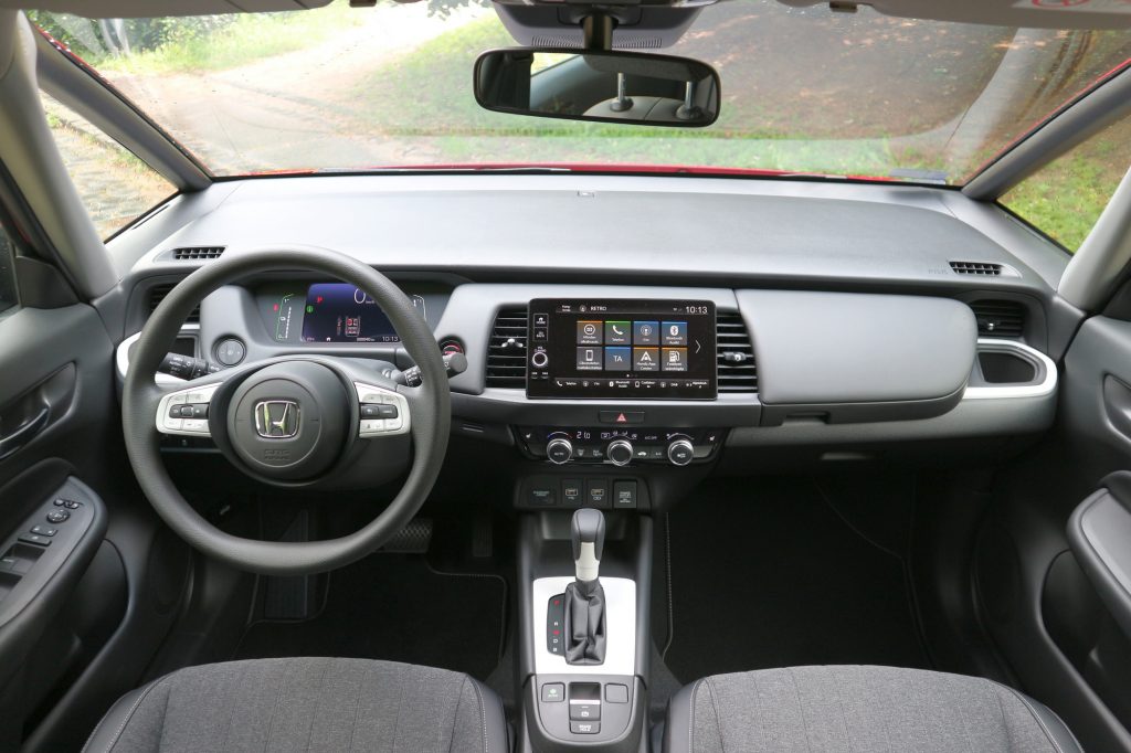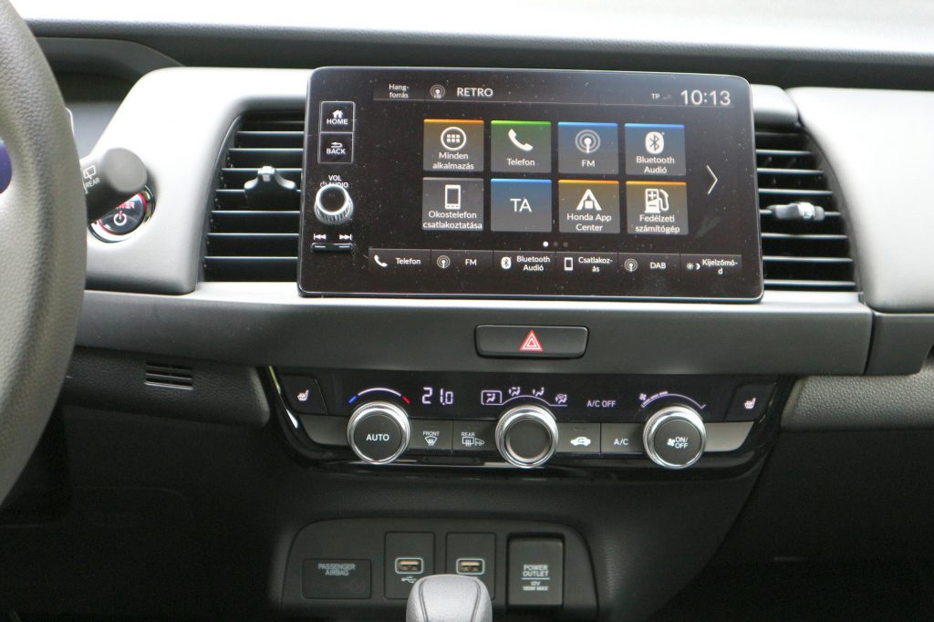 Apróság, de jellemző a Jazz életfilozófiájára, hogy bár a menüben megtalálhatjuk a klasszikus hibrides energiaáramlási animációt (ami megmutatja, megy-e épp a benzinmotor, hajtottak-e a kerekek vagy visszatöltenek a generátor-üzemmódra kapcsolt villanymotoron keresztül) teljesítménymérő műszer vagy fordulatszámmérő nincs. Sehol nem lehet követni, mennyire dolgoznak a motorok, mennyi energiát használok, milyen intenzíven megy a visszatöltés a lassításoknál. Úgy tűnik, a Honda úgy gondolta, ezekkel a műszaki jellegű dolgokkal a Jazz vásárlói nem akarnak foglalkozni. Ők csak menni akarnak, sodródni a flow-val, ügyet sem vetve ezekre a prózai dolgokra, hogy kilowattok, százalékok vagy fordulat/percek. A lényeg, hogy haladjunk és közben érezzük jól magunkat.