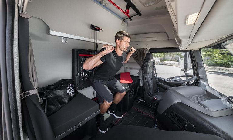 A kamionsofőrök munkája azzal jár, hogy rengeteget ülnek a volán mögött, de ez nem jelenti azt, hogy ne lehetnének fittek. Az Iveco a legújabb nyerges vontatójában remek edzőtermet rendezett be.