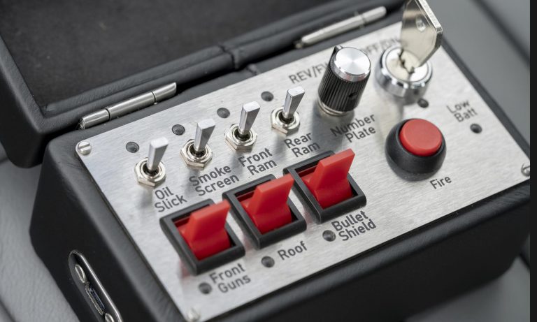ezért a lámpa mögül előbújó gépágyú csak fényt és hangot ad, hátrafelé olaj helyett legfeljebb vizet tud spriccelni az autó. De benne lesz a golyóálló pajzs és a füstködöt kibocsátó rendszer, az utastérben minden kapcsoló, a telefon és még a korabeli navigációs rendszer is a helyén lesz.