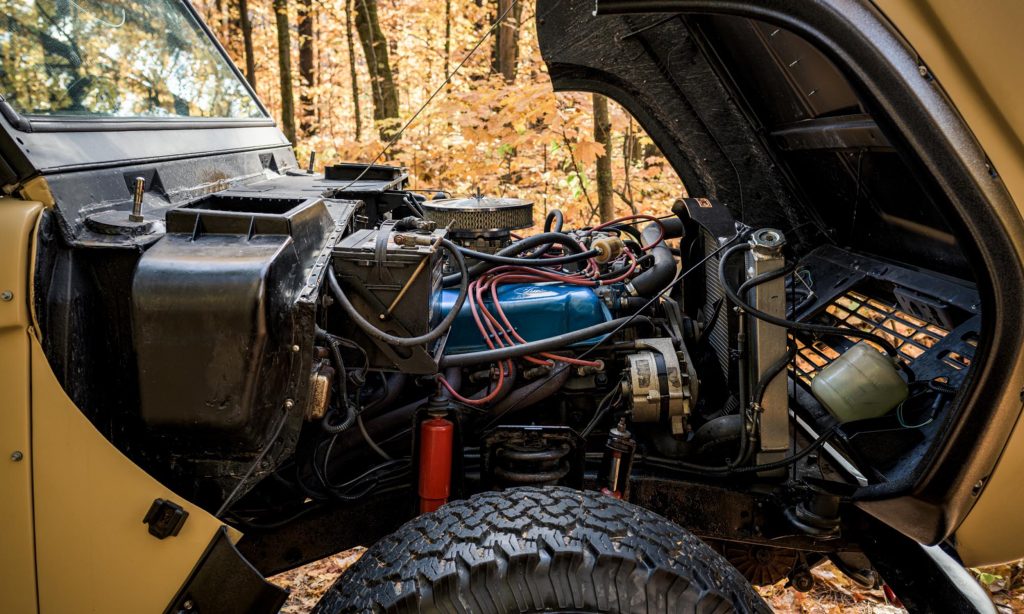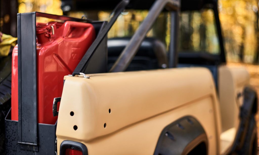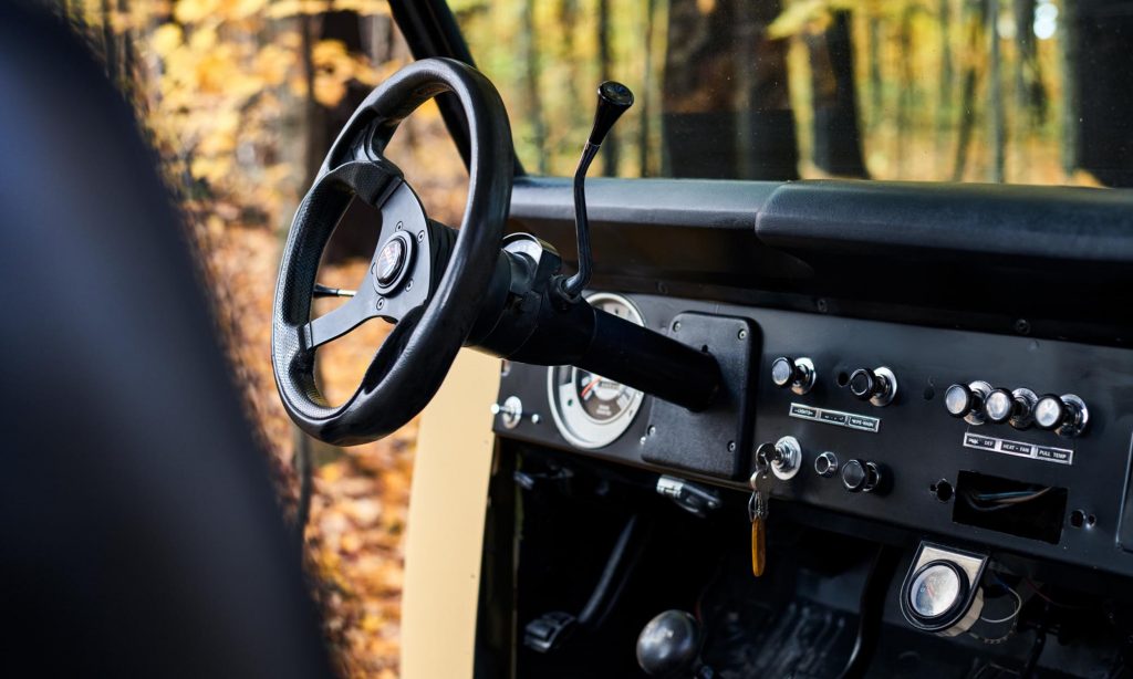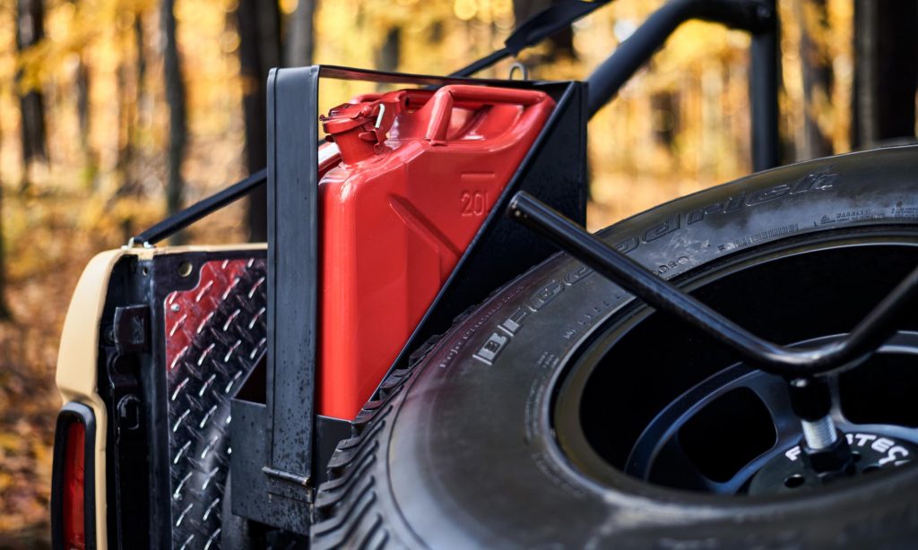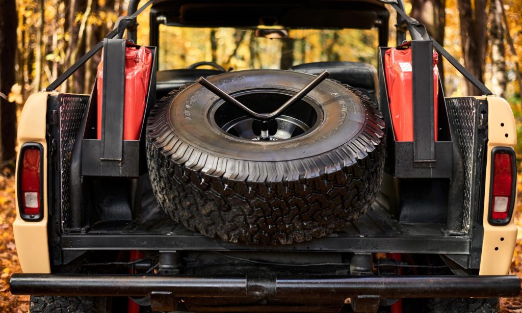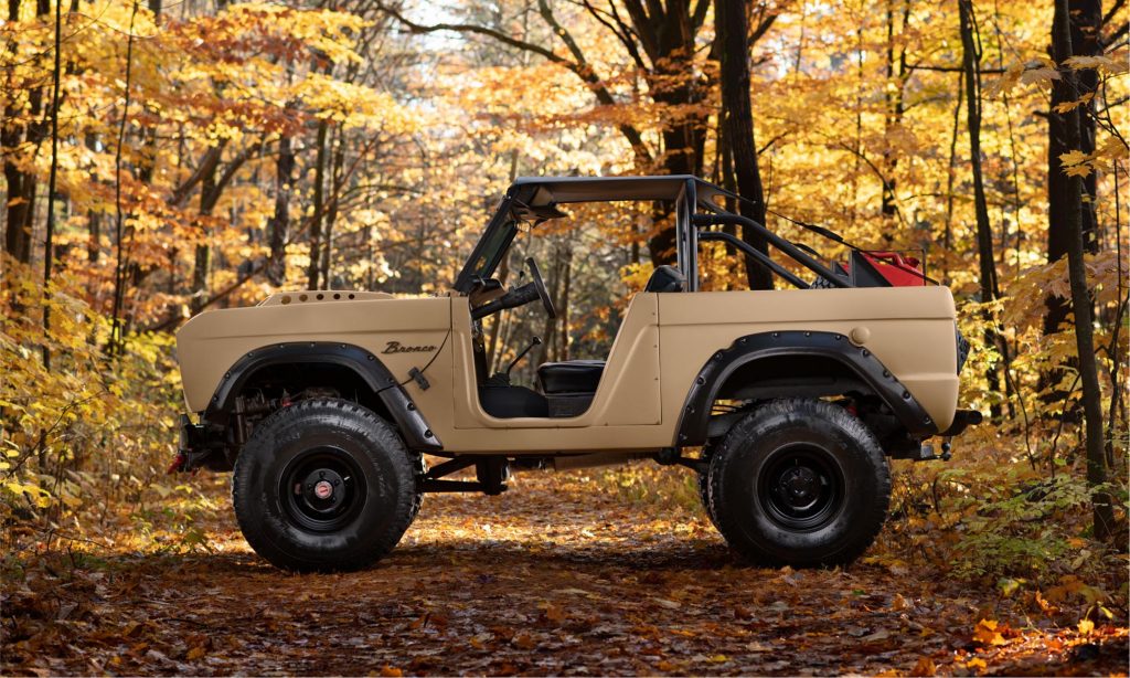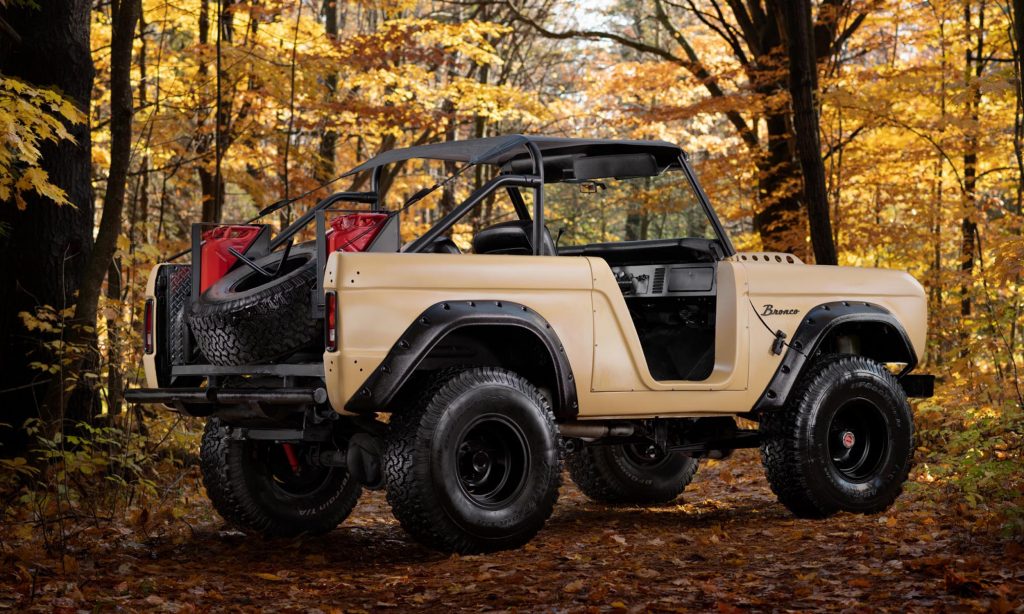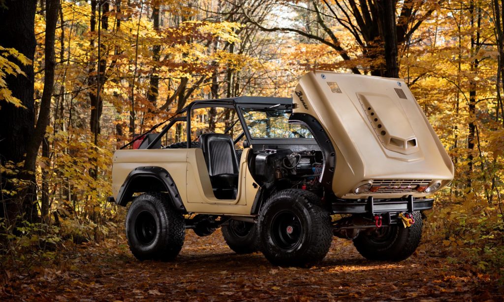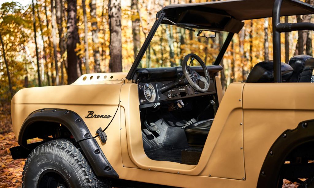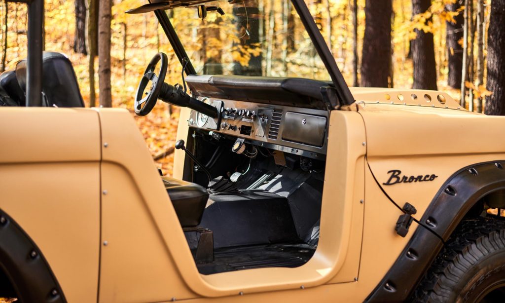 A homokszínűre fényezett Bronco stílusos műbőrülései egy 1968-as Mustangból származnak, a hátsó ülések helyére pótkerék és benzinkanna került. Az esőtől csak egy kis vászondarab védi az utasteret, de