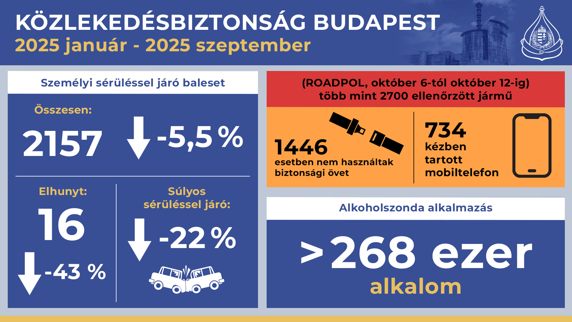 Idén szeptember végéig tizenhatan haltak meg közlekedési balesetben Budapesten, ami pont tizenhattal több az elfogadhatónál, pedig ez jelentős javulásnak számít, mert tavaly huszonnyolc halálos áldozat volt az első kilenc hónapban. A személyi sérüléssel járó közlekedési balesetek száma is csökkent kicsit, a 2157 eset 5,5 százalékkal kevesebb a tavalyinál.