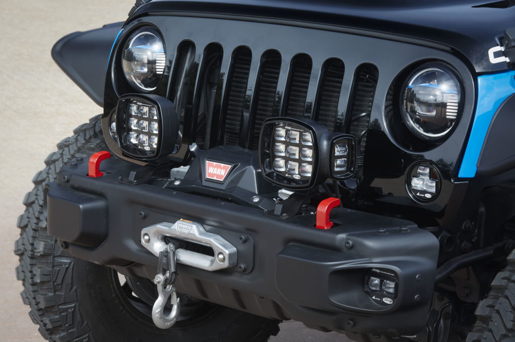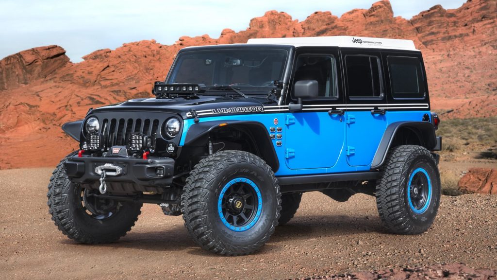 A Jeep Luminator neve is beszédes, ennél a tanulmánynál minden a lámpákról szól. Nem elég, hogy a lökhárítóra, a hűtőmaszk elé és még a motorháztetőre is szereltek LED-es fényszórókat, az elöl lévő lámpák a kormánykerék elforgatásával párhuzamban fordulnak el.