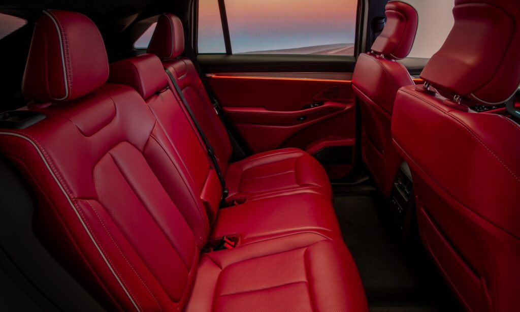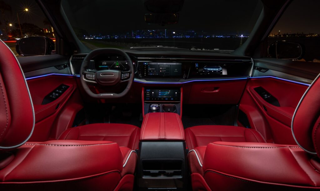 Kétküllős kormánya mögött digitális műszeregység van, a középkonzolon pedig két érintőképernyő, melyek közül az alsón a klíma virtuális gombjai jelennek meg, de ezzel még nincs vége, hiszen az utas oldalán is akadt egy érintőkijelző a Wagoneer S-ben. Az utastér hangulatvilágításához 64 szín közül lehet választani, a kilincsek pedig villanyautós szokás szerint elektromosak.