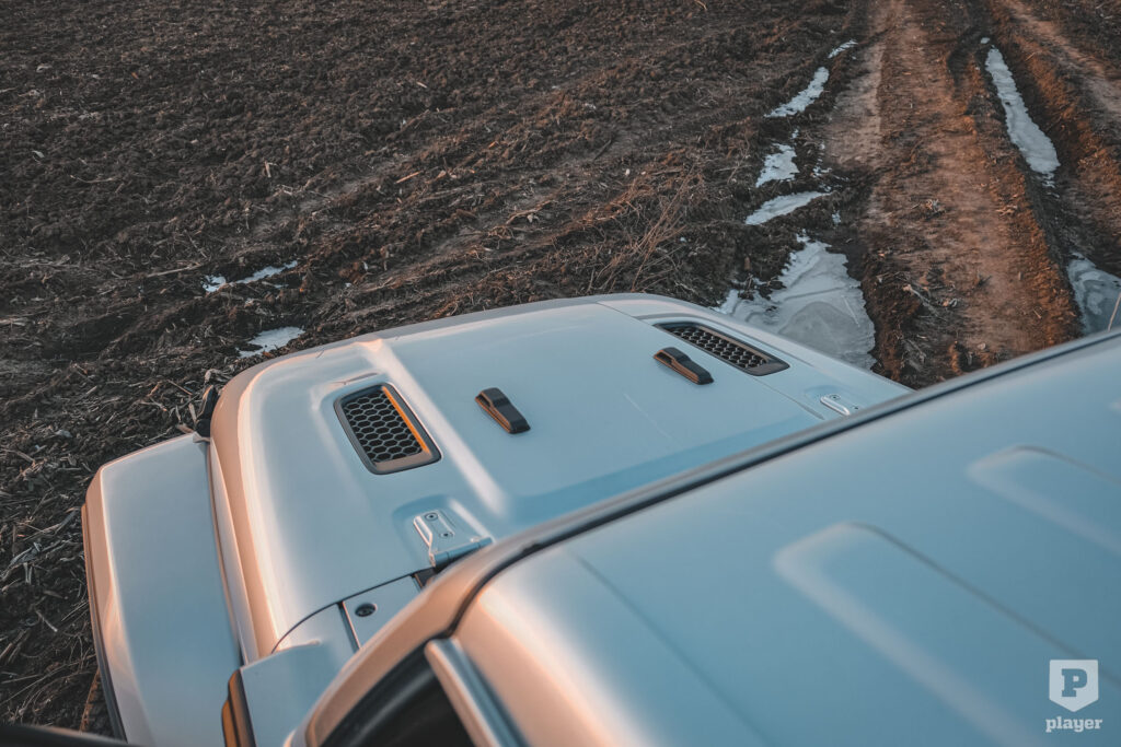 Hihetetlenül hatásos például, ahogy a múltidéző külső sárhányókba integrált modern menetjelző lámpa és a Willystől eredeztetett hétlyukú függőleges hűtőmaszkból kikukucskáló LED-es fényszóró között ott feketéllik a motorháztető mechanikus rögzítőfüle: