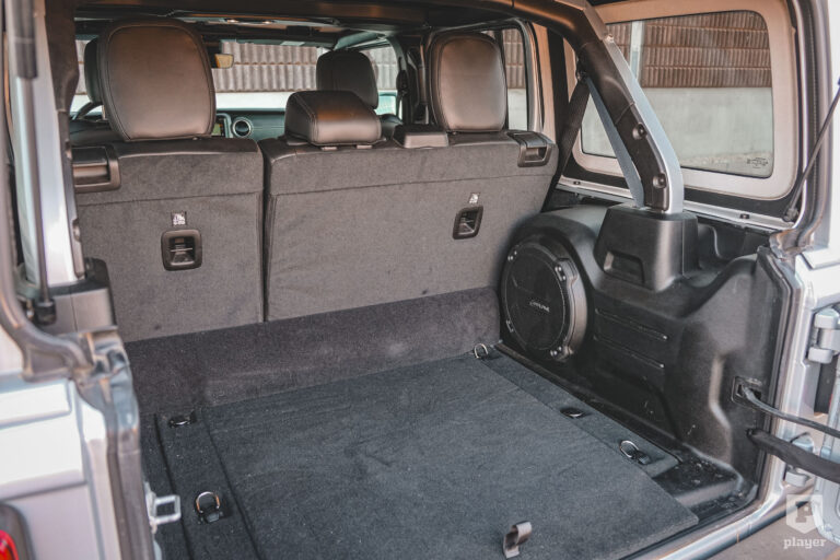 Hely – hát az nem sok van benne. A Wrangler nem SUV, terepjáró, tehát a hosszú, magas, széles autó belteréből igen sokat foglal el a technika alul és a borulókeret felül. Igen, bukókeret: ez egy teljesen lebontható karosszériájú autó, de azért ilyenkor sem maradnak az utasok borulásvédelem nélkül.