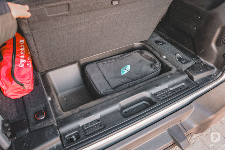 Hátul a négy óriási, minden finomságtól mentes külső zsanér (kettő az oldalra nyíló raktérajtónak, kettő a felfelé nyíló hátsó szélvédőnek) mellé hanyagul odakent fénydiódás zárófény is baromi jól néz ki. Szép és jól besimul az összképbe még az A-oszlop tövébe, balra, egész praktikus helyre rakott, bátran formázott fészekbe került töltőcsatlakozó is. Ahogy pedig a tolatókamera átbújik a kívülre akasztott pótkeréken, az már parodisztikusan zseniális!