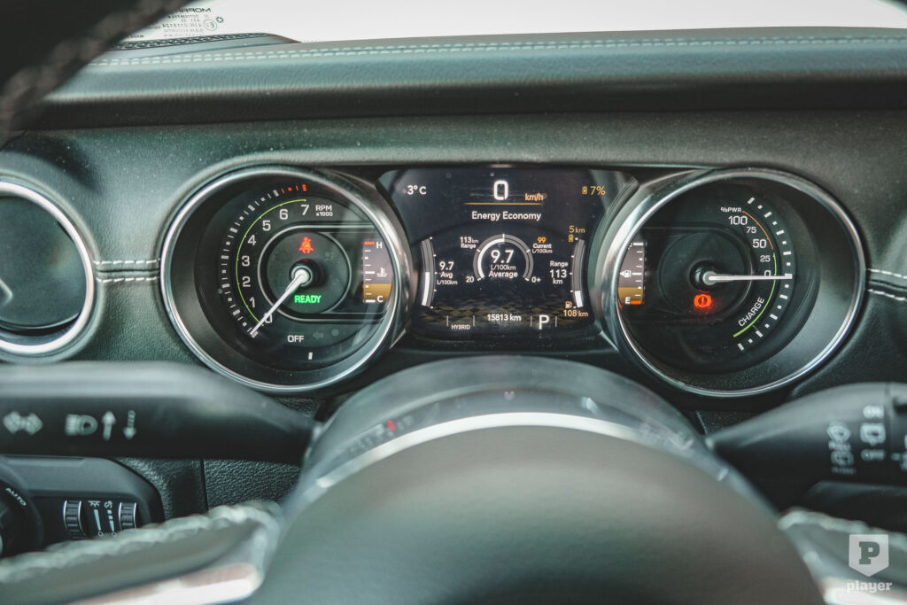 Országúton az ember hajlamos kihasználni a plug-in Wranglerben az erőt és a dinamikát (0-100: 6,5 másodperc a 2,4 tonnás kocsival, elképesztő!), így aztán az erőteljes gyorsításokkal és a könnyen a megengedett fölé csúszó sztrádatempóval, villany ide, villany oda, nagyon könnyű jóval tíz liter fölé szaladni a fogyasztással még a 100-200 kilométerenkénti teljes töltésekkel együtt is. Az én kezeim között 700 kilométerre 9 literes átlagfogyasztás jött ki benzinből, de úgy, hogy ebben a fedélzeti számítógép szerint alig 400 benzines kilométer mellett volt csaknem 300 kilométer elektromos üzem is. Ez persze nem csak a konnektorból származó villannyal megtett utat jelenti, benne vannak a lassításokkal visszatermelt wattórákkal nyert méterek is.