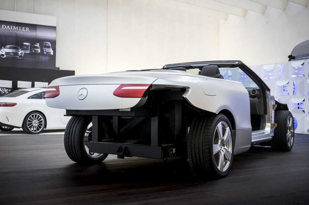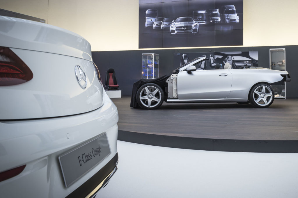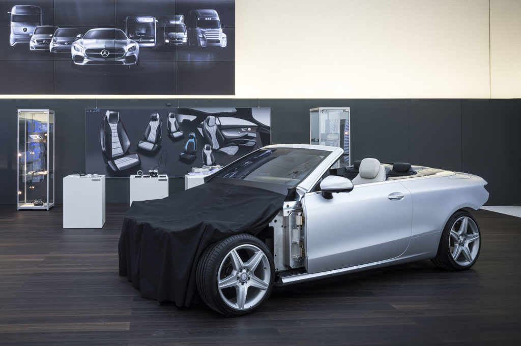 Amikor a Mercedes-Benz formatervezői stúdiójában jártunk, már álcázás nélkül láthattuk, meg is tapogathattuk az E-osztály kabrióváltozatát, pontosabban annak prototípusát, de képet persze nem készíthettünk róla. Már a bejáratnál elvettek minden képkészítésre alkalmas eszközt, és még a mobilok és laptopok kameráit is leragasztották, nehogy kiszivárogjon róla egy kép.