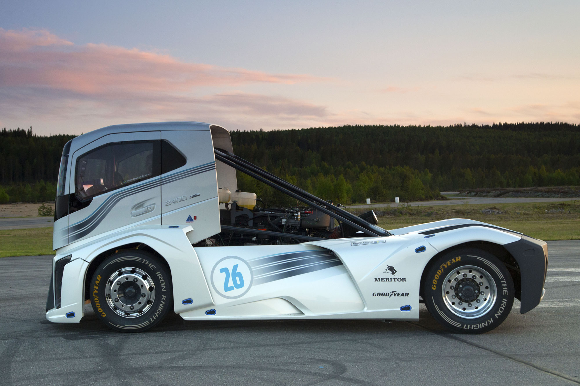 Sokat mondóan The Iron Knight névre hallgat az a kamion, amellyel két gyorsulási világrekordot is megdöntött a Volvo. A speciális jármű az FH vontató alapjára épül, de a technikáját alaposan felpumpálták, áramvonalas fülkéjét üvegszálas anyagból készítették el, a 4,5 tonnás kamionhoz pedig a Goodyear fejlesztett ki speciális abroncsokat, amelyek bírják a gyűrődést. 13 literes dízelmotorja négy turbótöltővel az eredeti 510 helyett 2400 lóerős teljesítményre képes, és 6000 Nm a legnagyobb nyomatéka, így lehet némi fogalmunk arról, mire is képes.