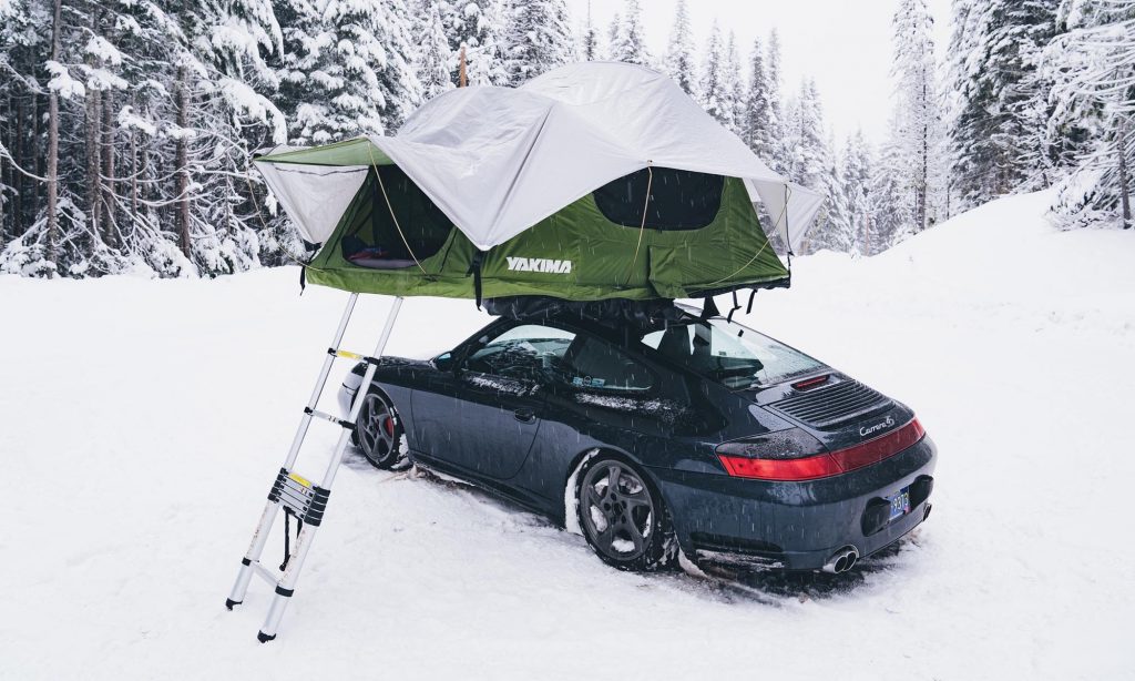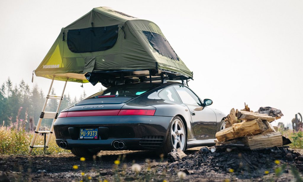 Nem erre szánták, de kempingezni is kiváló lehet egy 911 Carrera 4S, ha a Porsche tetőcsomagtartójára tökéletesen illik a sátor. Az összkerékhajtású sportautóval szokatlanul vadregényes helyekre jár a gazdája.