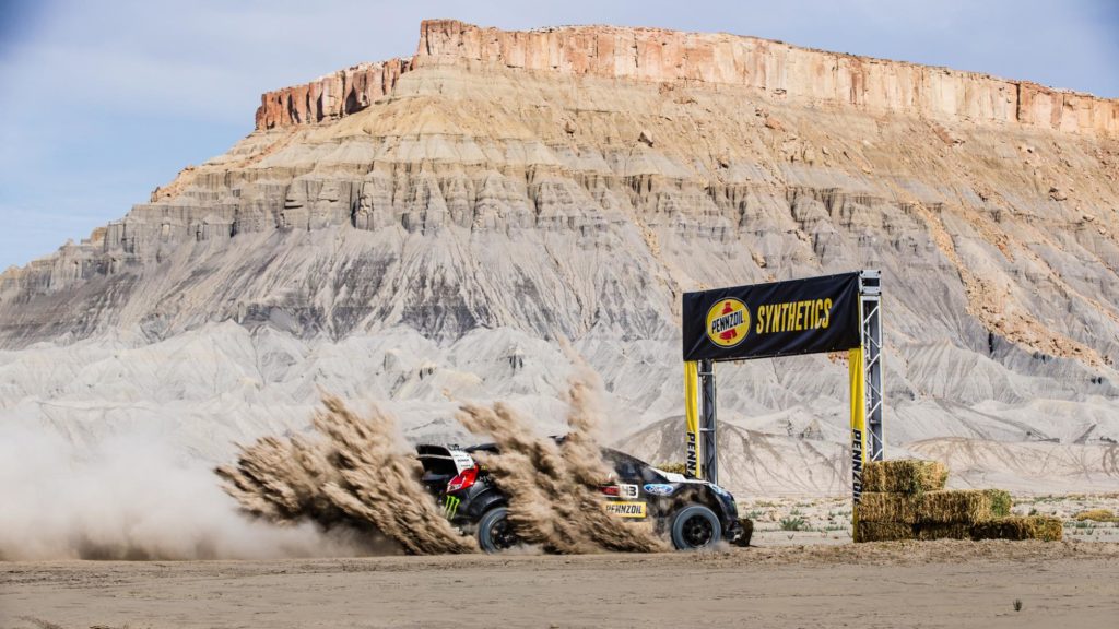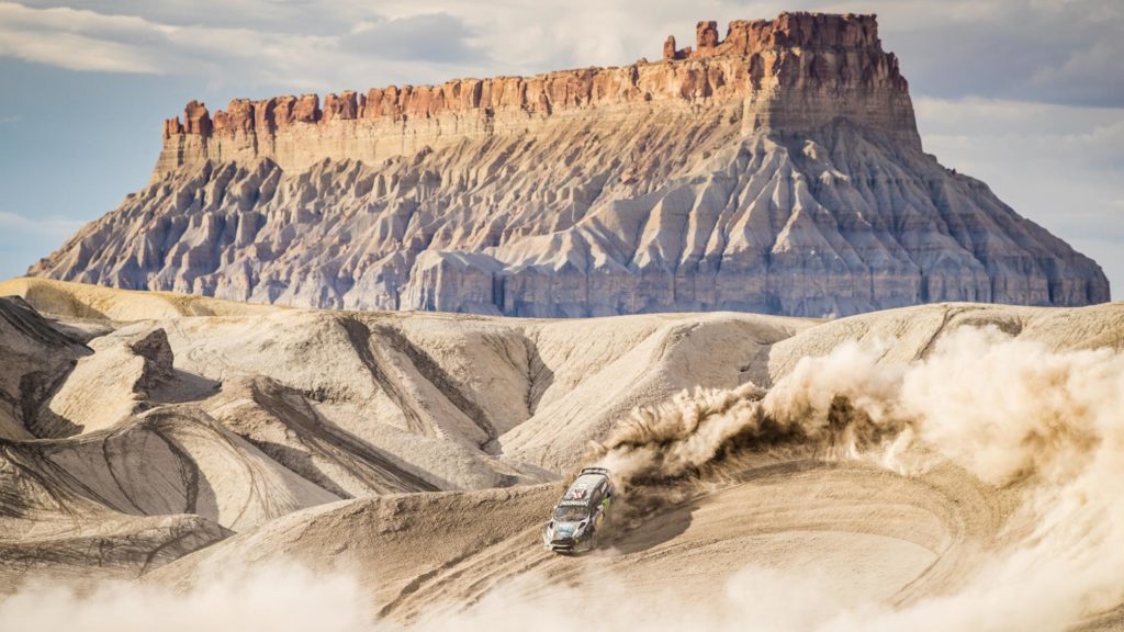 Ilyen pályára kiváló választás volt a Fiesta ralikrossz-változata, aminek 600 lóereje Ken Block szerint szinte már sok is a laza talajra, ahol a nagy rugóutak és a bütykös terepgumik nagyon is jól jönnek. A helyszín a Swing Arm City, egy látványos off-road pálya Utahban, ezért nemcsak Ken Block mutatványait, hanem a tájat is csodálhatod.