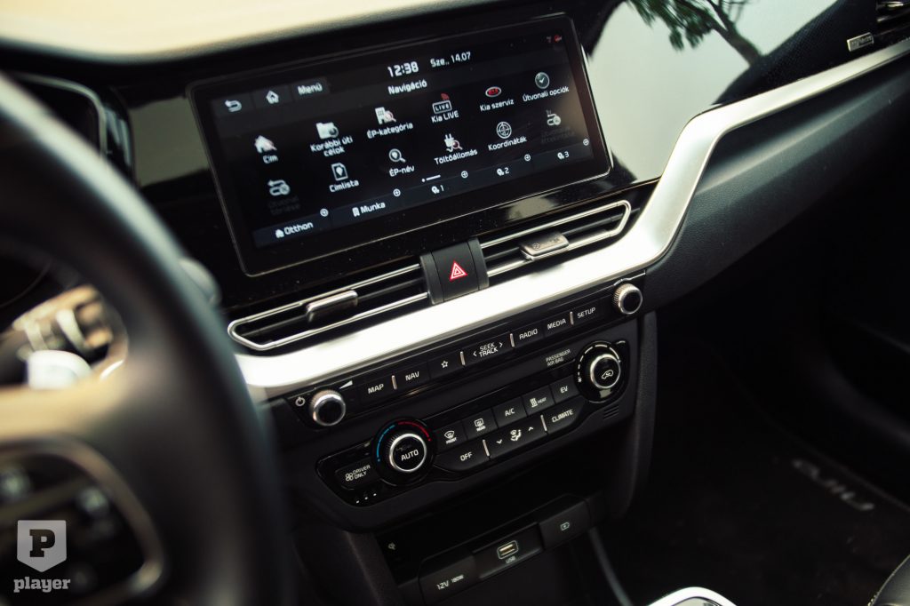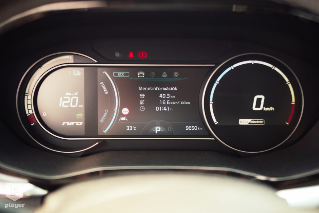 A Kia e-Niro adaptív sebességtartójával beálltam egy adott sebességre, ami a gyér forgalomnak köszönhetően kb. végig tartható a fentebb említett autópályán. Sajnos egy kicsit túl van biztosítva ez a funkció – gondolom, nem véletlenül –, mert az én emberi agyam sokkal később kezdene el lassítani az előttem megjelenő autó láttán, ellenben a Kia már százméterekkel korábban lassít.