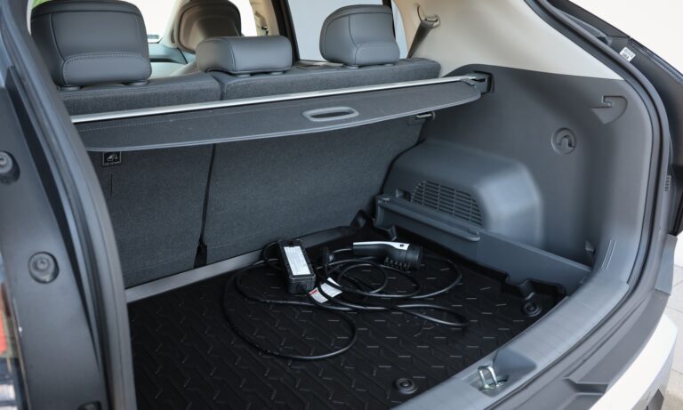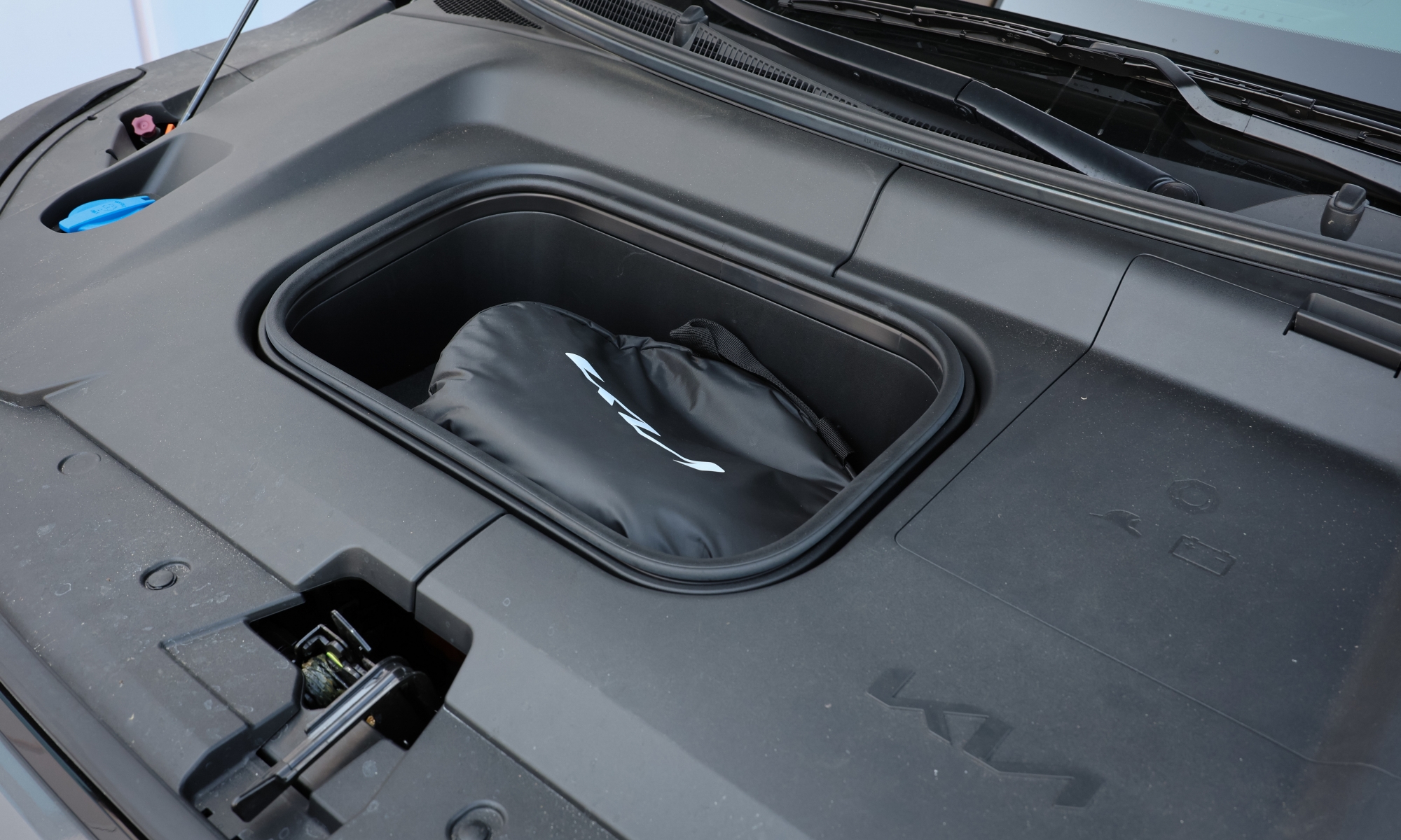 Csomagtartója a katalógus szerint a hátsó ülések mögött 460 literes, de ennek egy része valójában a padló alatt van, ahová a töltőkábelek, kötelező tartozékok és a V2L csatlakozó (mert az EV3-ról akár más fogyasztókat is lehet tölteni) foglalja el. Hasznos, hogy kivett kalaptartónak is van helye, amennyiben az 1251 literes rakteret kell bevetni. Az orrában van még egy nagyobb cipős doboznyi hely (25 liter) is a kevésbé gyakran használt, de időnként szükséges holmiknak.
