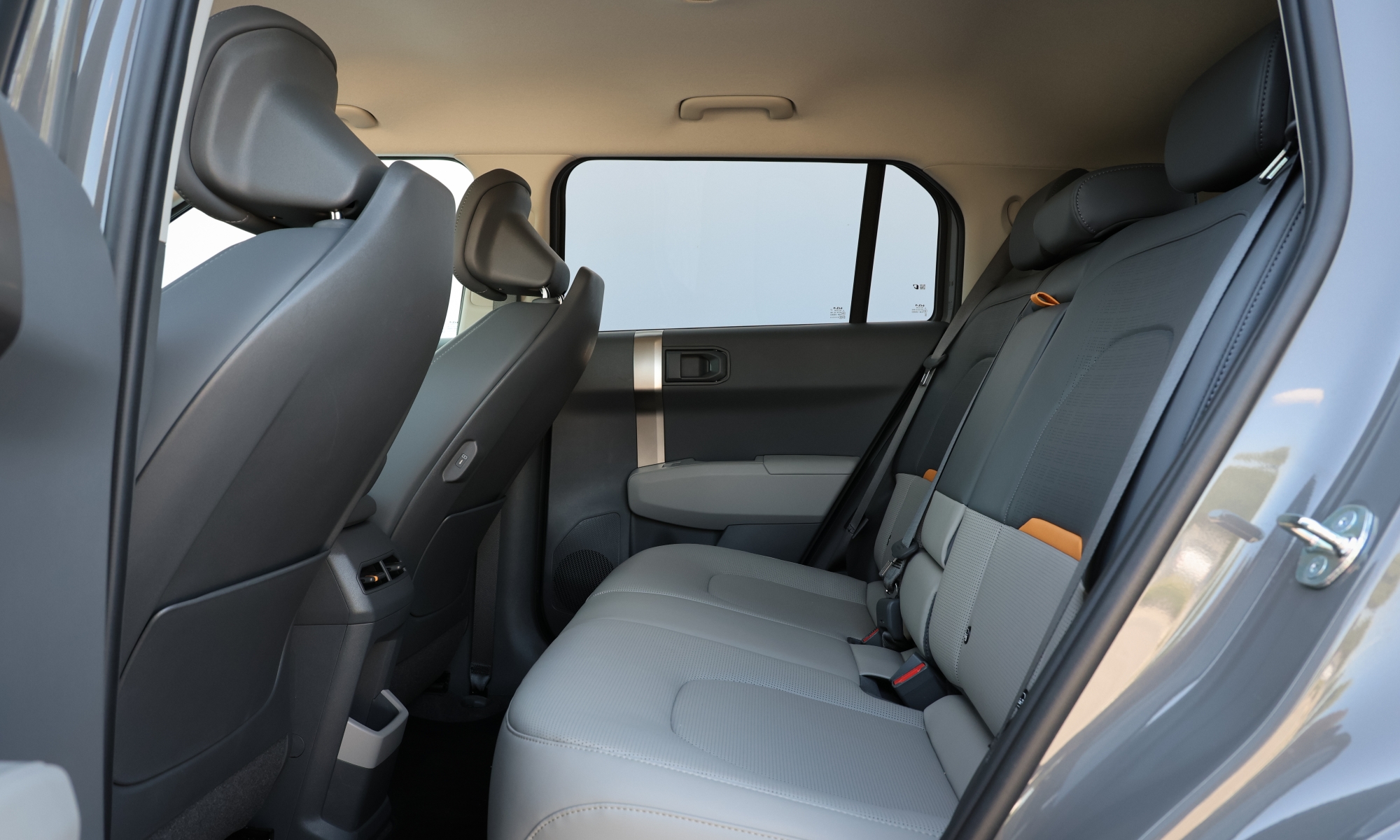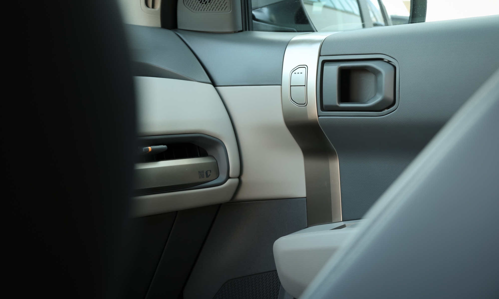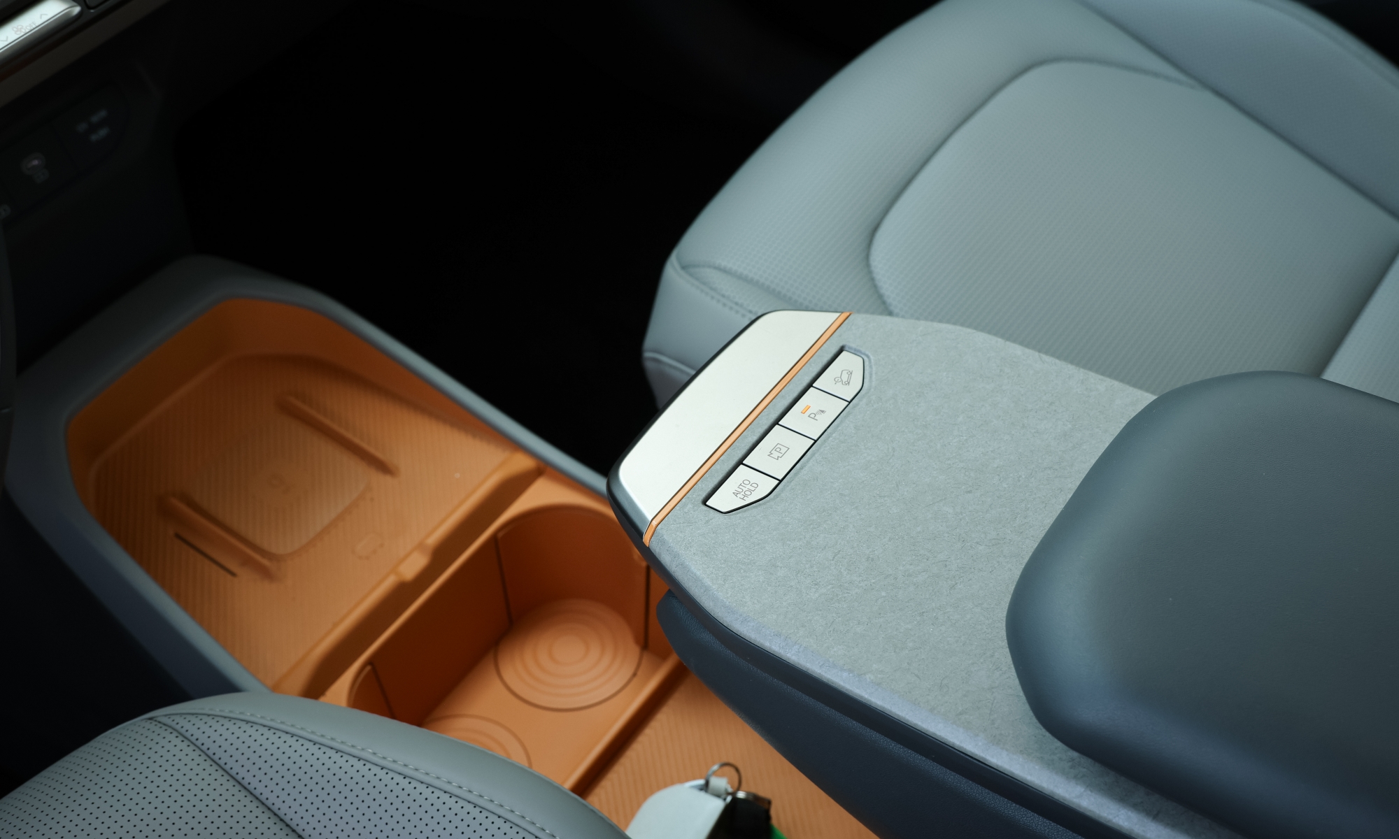 Első kilincsei az ajtólapokba simulnak és a kulccsal közeledve ugranak ki, a hátsókat pedig a tetőoszlop fekete betétjébe rejtették, hogy uralkodó legyen a minimalizmus. A Kia EV3 utasterében mindenhol hideg szürke árnyalatok vannak, melyeket remekül ellensúlyoznak az élénk narancssárga betétek a műszerfalon és a középső tárolón. Egy nagy rekesz, két gombnyomásra forduló pohártartó és vezeték nélküli töltő is van ezen a felületen. A könyöklőn egy konyhapult mintázatú kihúzható asztalka van néhány gombbal, de sajnos nincs benne hasznos tárolóhely.