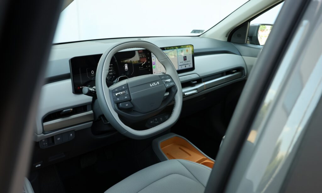 Tökéletesen rímel a formákra a szögletesített kétküllős kormány, de ezen a ponton a dizájn a funkció rovására megy. Egy hagyományos kormány még mindig természetesebb és biztonságosabb ennél. Karimája pont kitakarja a digitális óracsoport és a 12,3 colos érintőképernyő közötti kétzónás, automata klíma kezelőfelületét. Ezzel együtt is jó vezetni a Kia EV3-as alapváltozatát, melynek egyik legnagyobb vonzereje az elektromos Niróval szemben egyértelműen a stílusa.