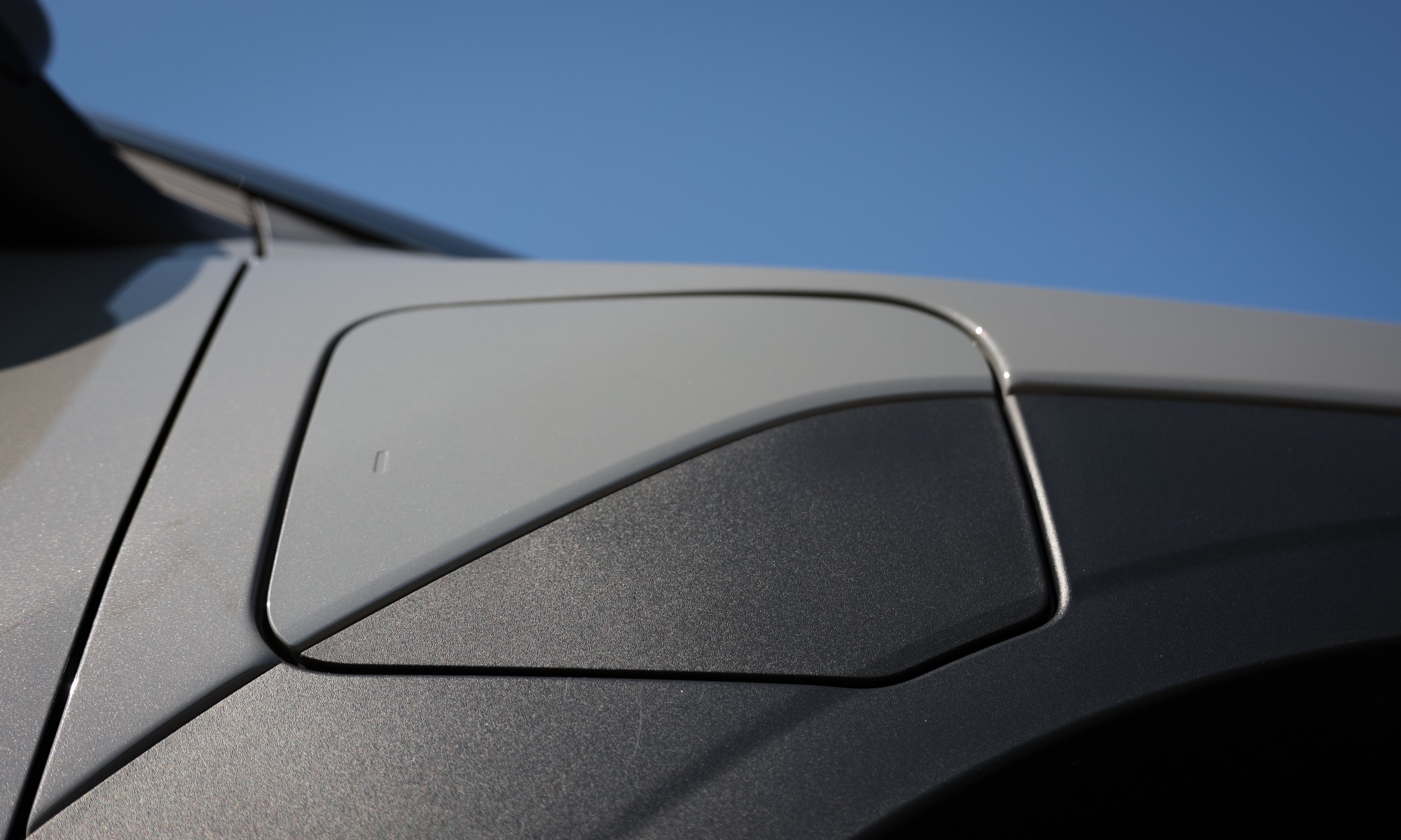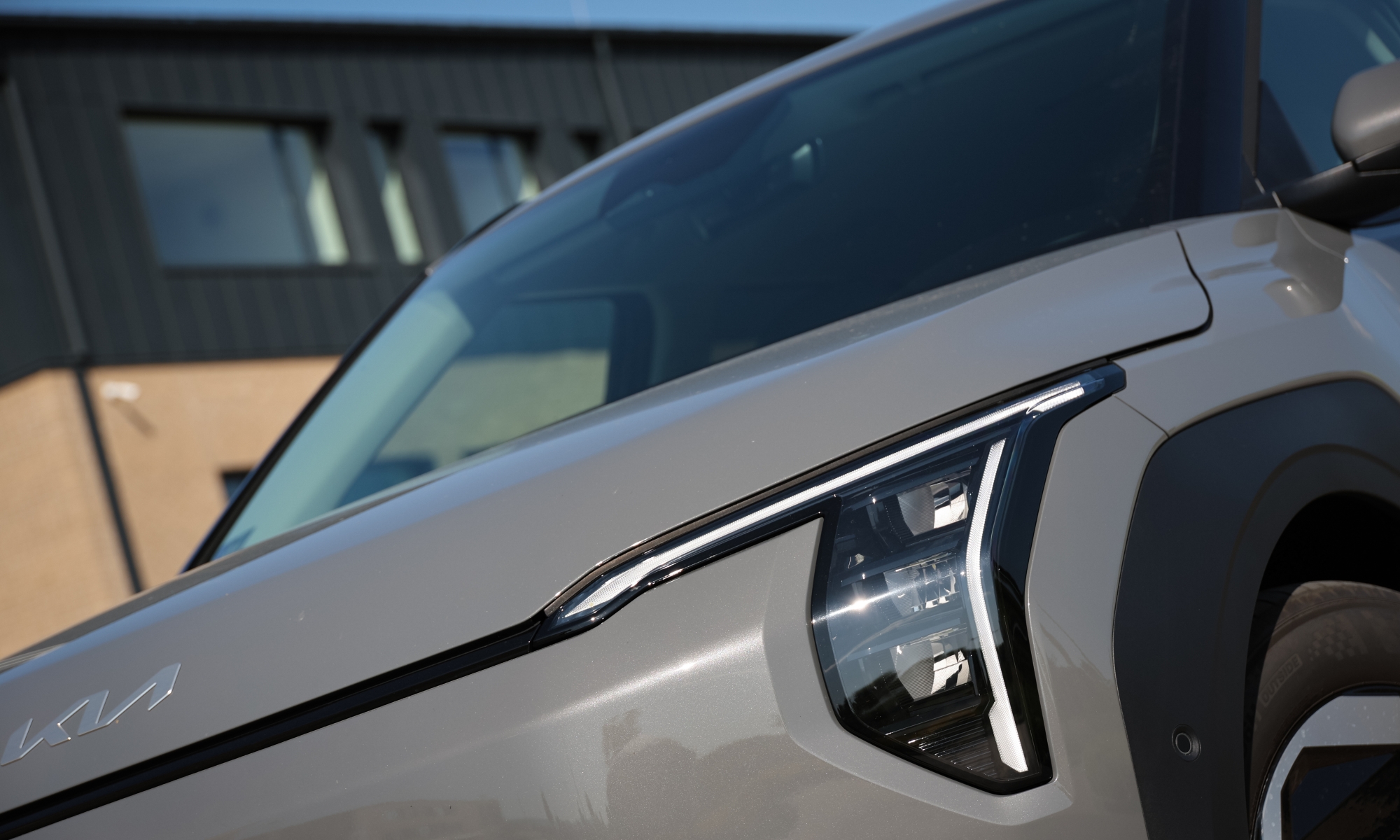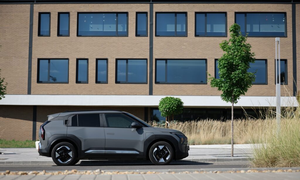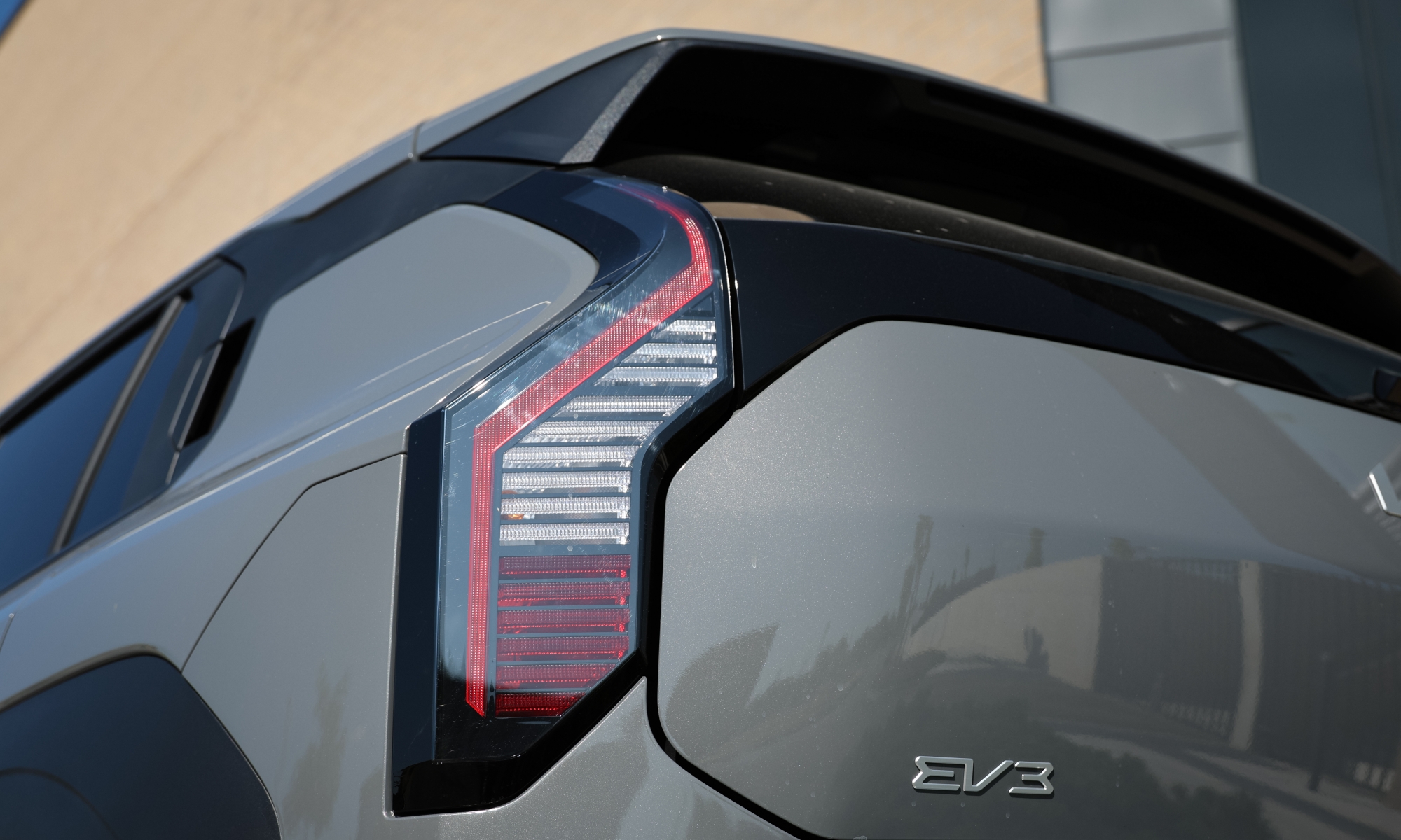 Szögletesen ugranak ki a lemezek a kerékjárati ívek felett, a 4,3 méteres Kia EV3 alapváltozatán masszív fényezetlen műanyag kontúrok futnak körbe az autón, de még így is feltűnően nagyok a lemezfelületek. Sarkaiban függőlegesen állnak a lámpák, melyek menetfénye áramkört mintáz. Töltőnyílása a jobb első sárvédőben van, a szögletessége még a kerékívekbe is belehasít. Annyira halványan lejt az EV3 tetővonala, hogy csak belülről tűnik fel, hogy mennyire elvékonyodnak az üvegfelületek, mennyire elfogy a fény, mennyire kilátástalan lesz az utastér végére.