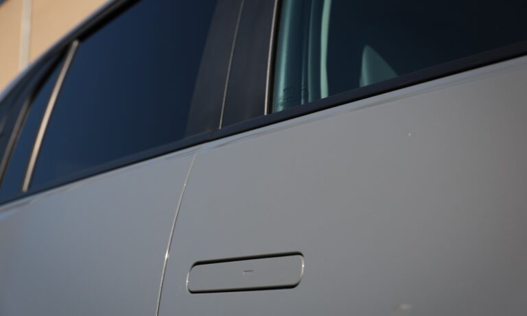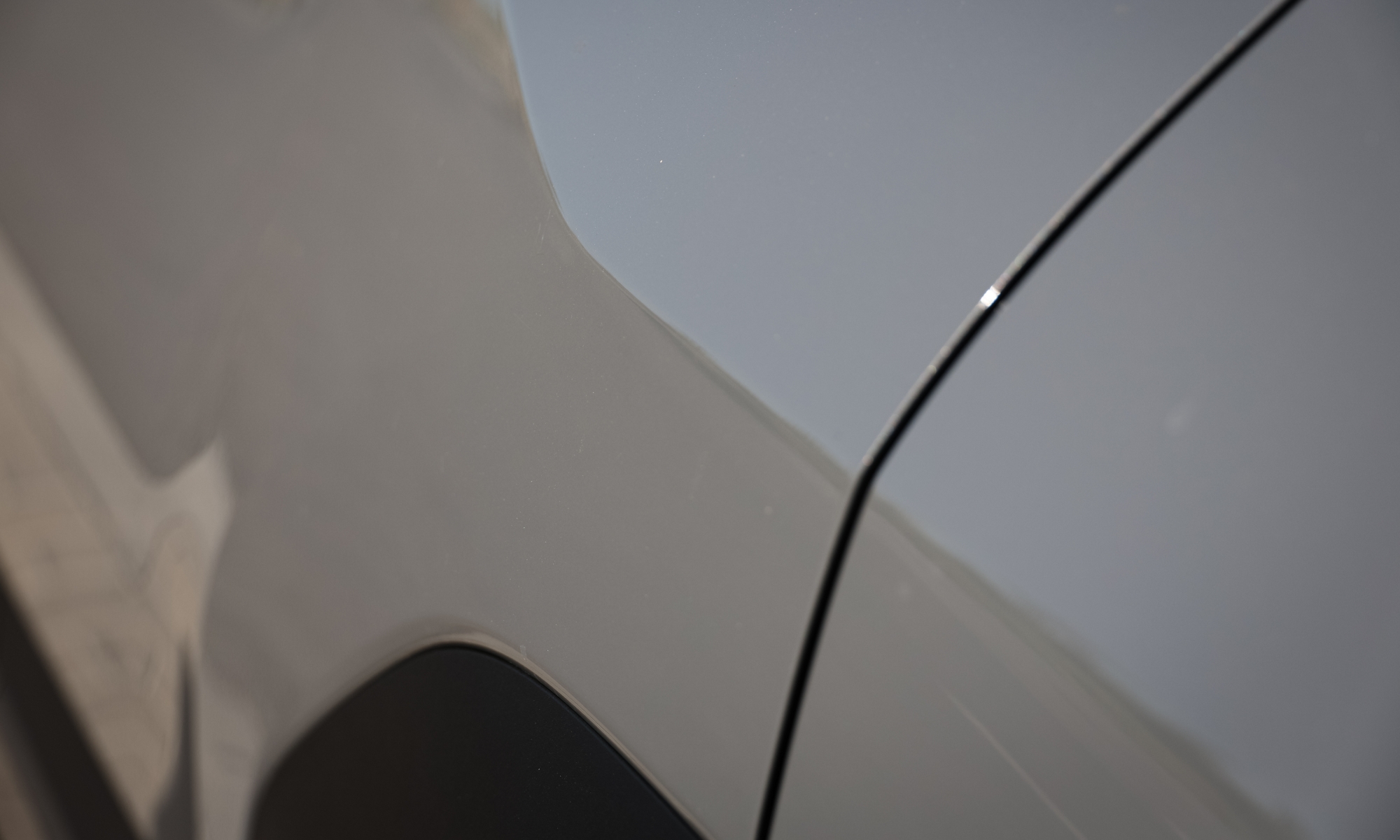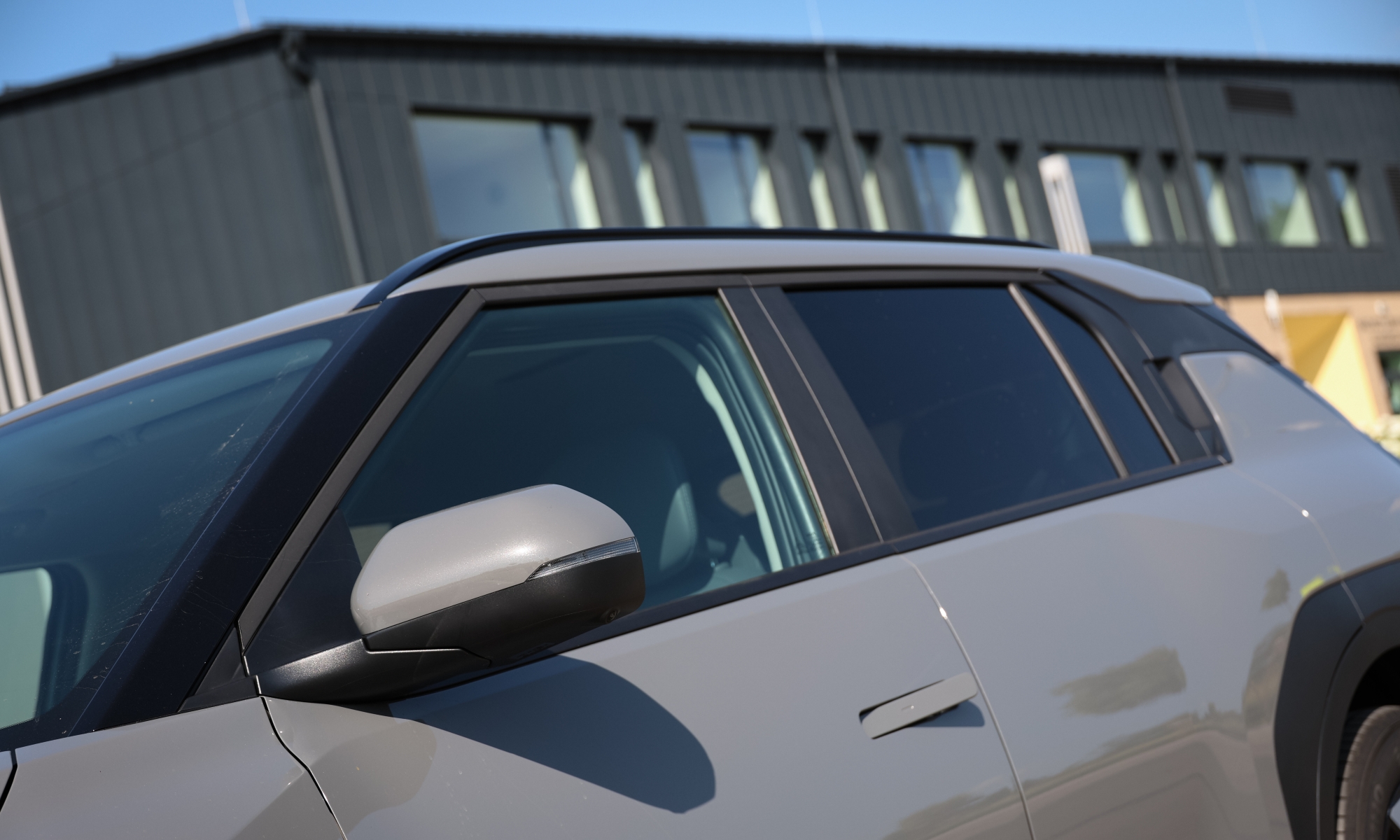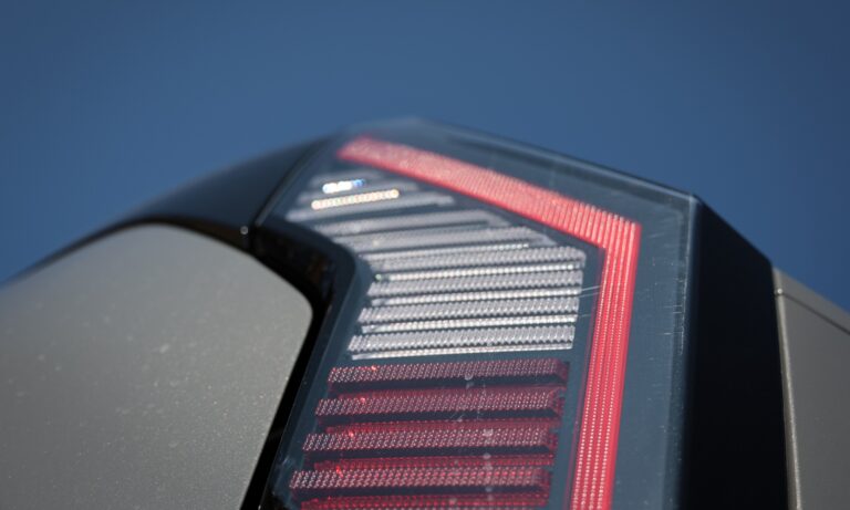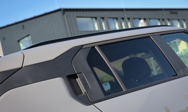 Szögletesen ugranak ki a lemezek a kerékjárati ívek felett, a 4,3 méteres Kia EV3 alapváltozatán masszív fényezetlen műanyag kontúrok futnak körbe az autón, de még így is feltűnően nagyok a lemezfelületek. Sarkaiban függőlegesen állnak a lámpák, melyek menetfénye áramkört mintáz. Töltőnyílása a jobb első sárvédőben van, a szögletessége még a kerékívekbe is belehasít. Annyira halványan lejt az EV3 tetővonala, hogy csak belülről tűnik fel, hogy mennyire elvékonyodnak az üvegfelületek, mennyire elfogy a fény, mennyire kilátástalan lesz az utastér végére.