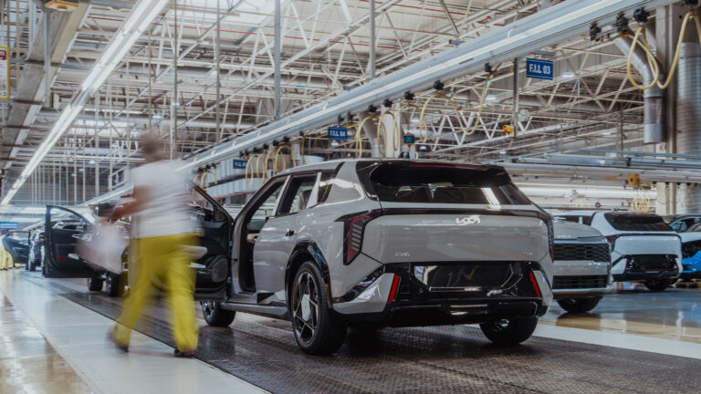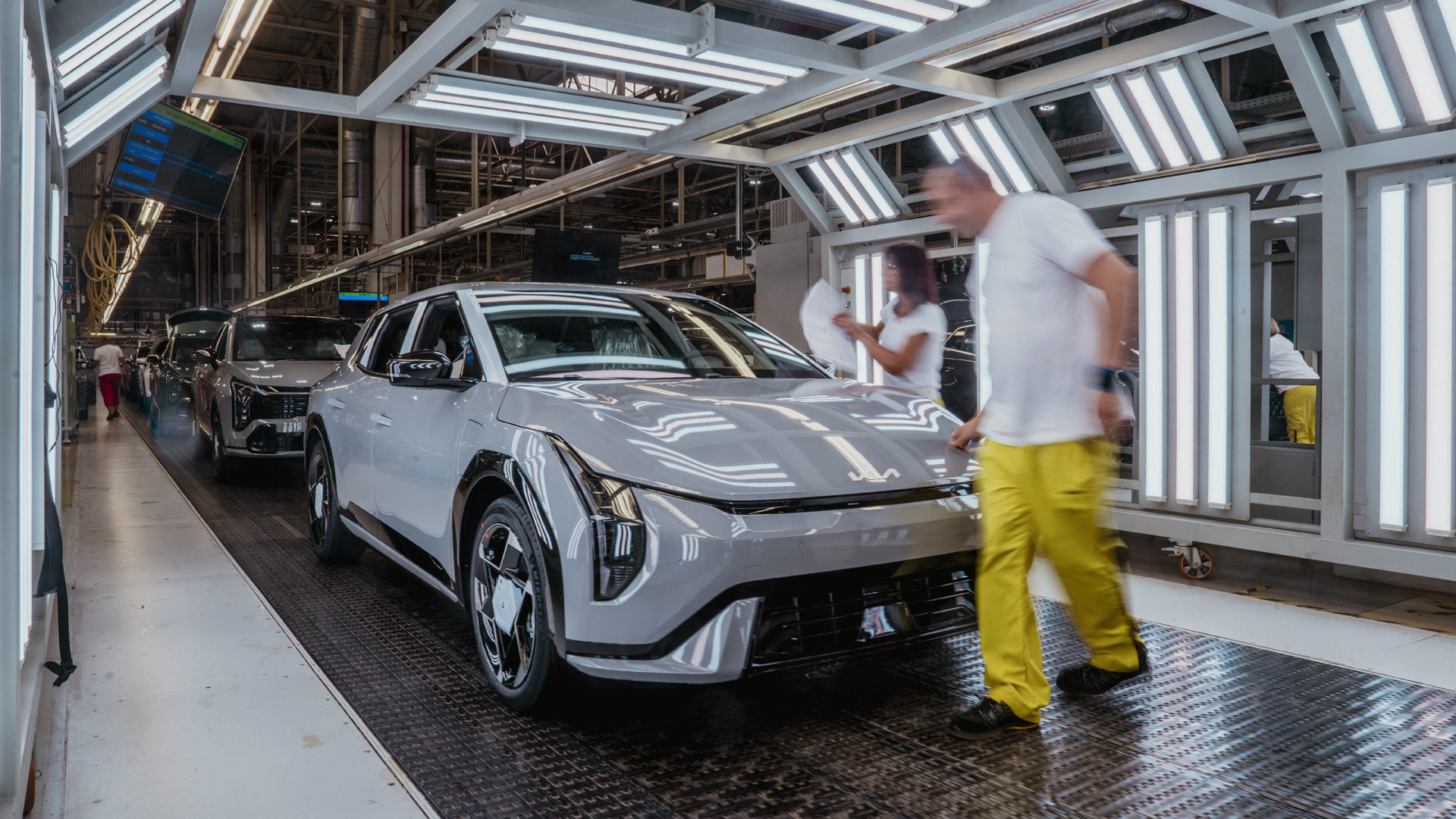 Nem először jártunk a Kia szlovákiai gyárában, és most is feltűnt, mennyire gyönyörű helyen van a hegyek lábánál fekvő üzem. Az első Ceed óta sokféle Kiát gyártottak itt, jelenleg főleg a Sportage, meg még egy pár XCeed is készül, aminek a pályafutását meghosszabbították – és mostantól velük egy gyártósorról gördül ki az elektromos EV4 is. Az üzem nagyban termel, évi 350 ezer autóra képes, a kapacitással tehát nem lesz gond.