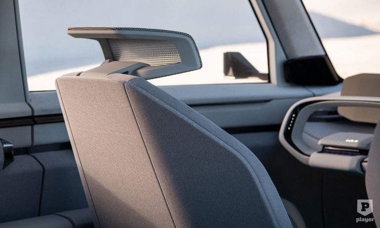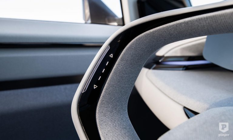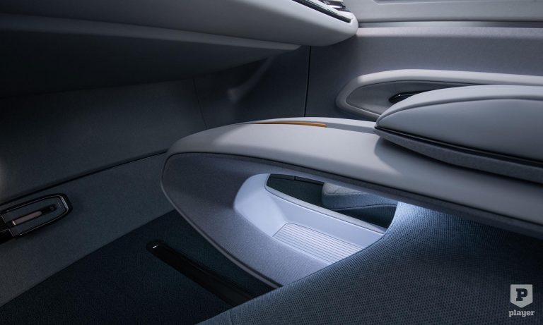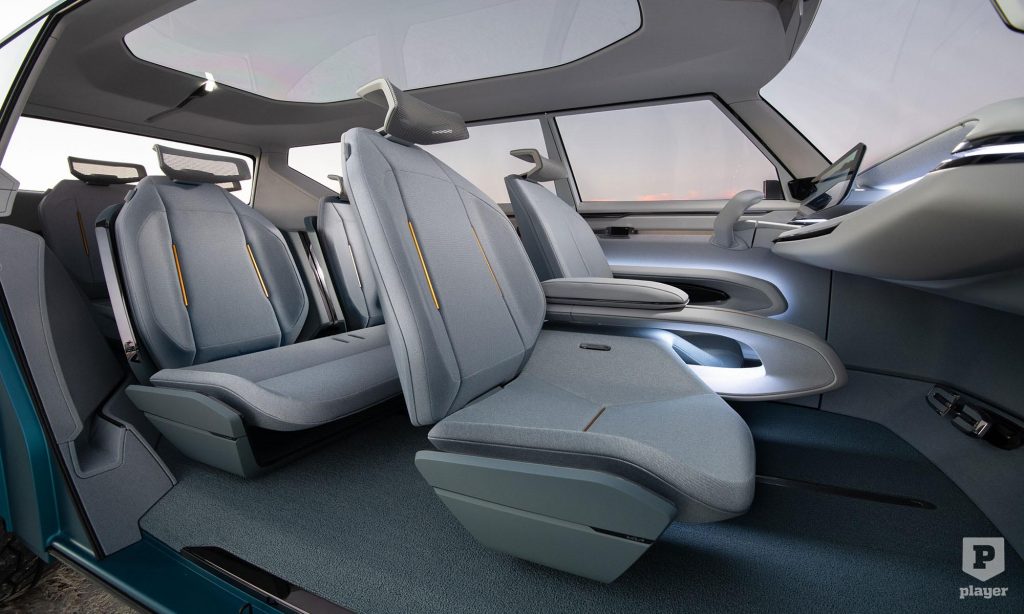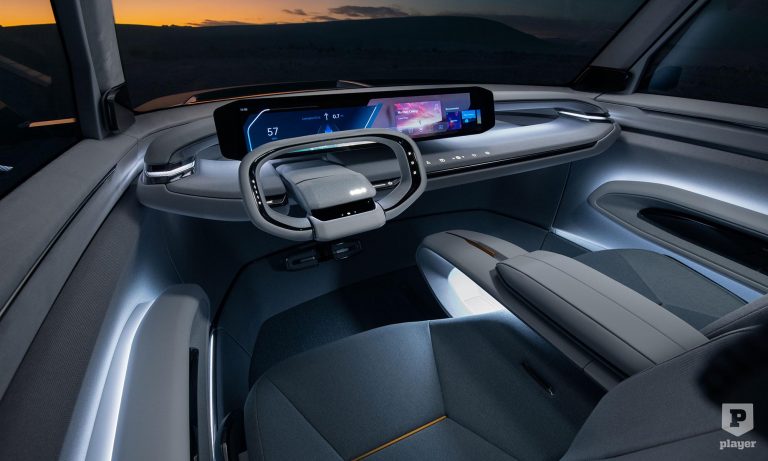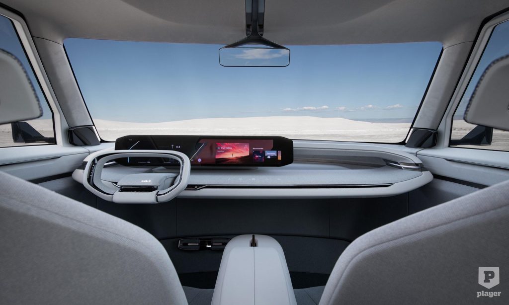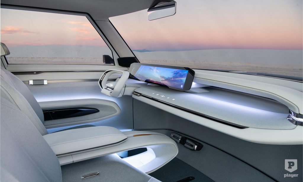 A hétüléses belső tér tanulmányautókra jellemzően futurisztikus, kényelmesnek tűnő fotelekkel, 27 colos képernyőből álló letisztult műszerfallal, és az önvezető autózás hajnalán csak jelzésértékű kormánykerékkel.