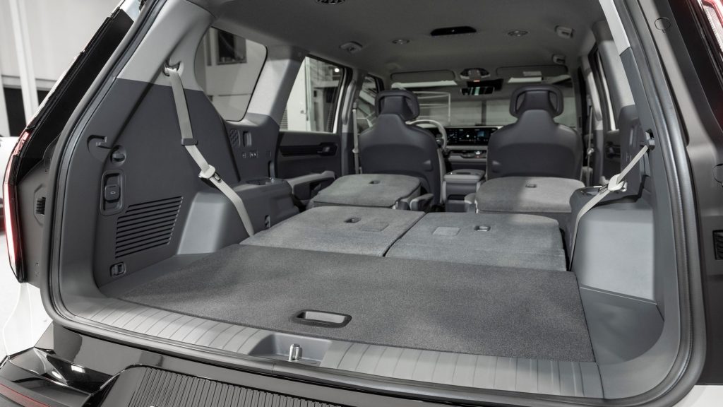 Az EV9, akár az EV6, 800 voltos akkut használ, ami brutálisan gyorsan tölthető. 15 perc alatt 249 km hatótávolságot tud felvenni, ha találunk erre az energiaátadásra képes töltőt. Az EV9 elméletileg készen áll a vehicle-to-grid használatra is, tehát nem csak tölteni tudja magát a konnektorból, de a hálózat energiatárolóként is használhatja, vissza is "szívhat" belőle energiát. Mivel azontban Európában egyelőre nemigen van sehol olyan infrastruktúra, amibe ez a technológia be lenne tervezve, egyelőre csak annak örülhetünk, hogy az EV9 mozgó áramforrásként is használható: 3,7 kilowattal terhelhető fedélzeti konnektoráról mondjuk a semmi közepén kempingezve is üzemeltethetjük a tévét, hűtőt, láncfűrészt.