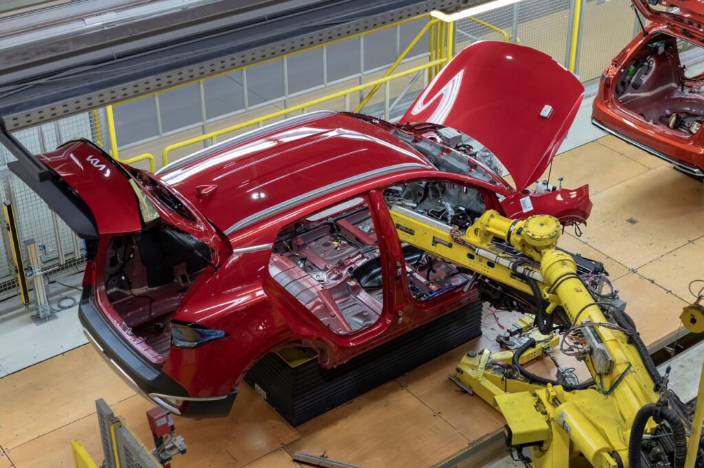 A karosszériaüzemben szinte mindent több száz robot végez, nem számít, hogy egy hibrid Ceed után egy plug-in hibrid Sportage érkezik, a precíz kalibrálásnak köszönhetően egyszerre több különböző formájú autó készülhet. A robotok nagy része egyébként Hyundai, de vannak KUKA és ABB gyártmányúak is. 2006-ban 406 robot dolgozott az üzemben, 2023-ban ezeknek 616-ra nőtt a száma. Minden nagyon tiszta, igényes és rendezett, ez különösen tetszett látogatásunk során.