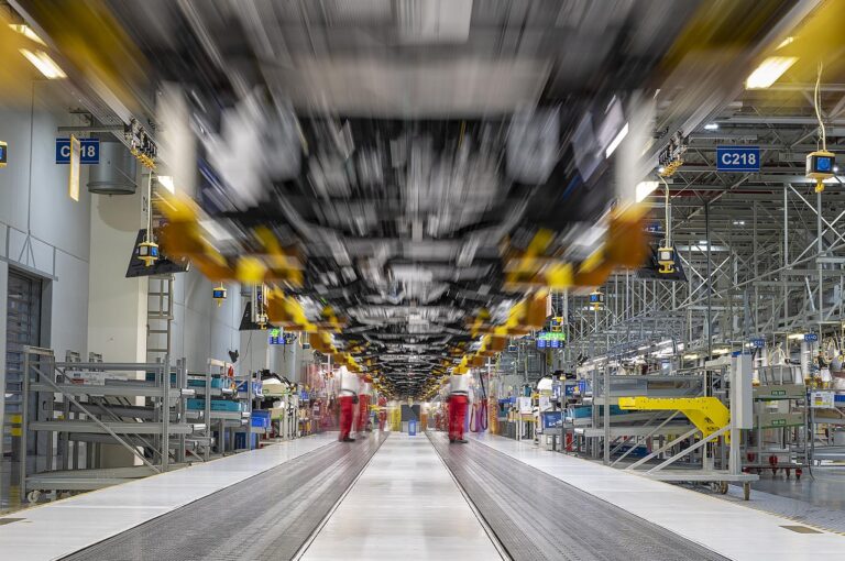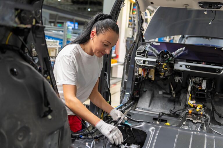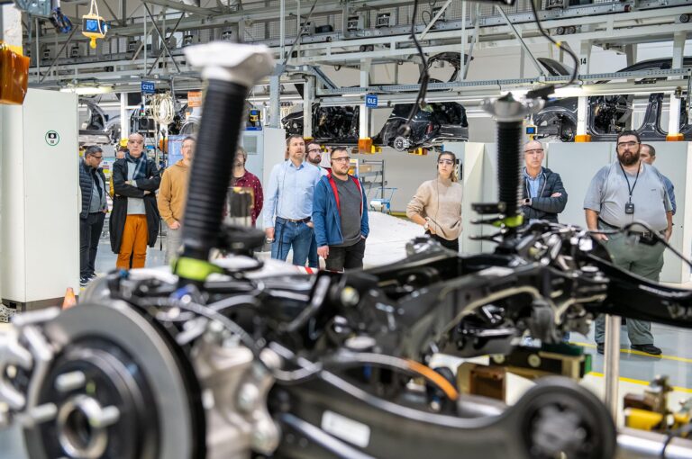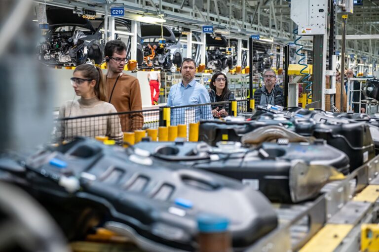 Egy autó kevesebb mint egy perc alatt: a körbevezetés során többször hangsúlyozták, hogy ilyen ciklusidővel készülnek az autók. Meglepődötten konstatáltuk, hogy a korábban említett 3800 dolgozóból alig láttunk néhány embert a karosszériaüzemben, a legtöbbször hölgyeket, targoncát vezetni. Ha már hölgyekről esett szó, a munkavállalók körülbelül 13-15%-a nő. Kiemelték, hogy minden részlegen más színű nadrágot viselnek a dolgozók, így szemmel látható, ki, melyik részlegen dolgozik.