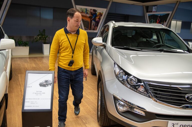 Az egyik számomra felejthetetlen momentum, ahogyan láttam, hogy a több mint 50 kilós műszerfalat – a súlyára pontosan emlékszem, hiszen még viccelődtem is vele, hogy az én súlyom nagyjából megegyezik egy Kia műszerfaláéval – egy pillanat alatt a helyére biggyeszti egy robot, és az autó mehet is tovább a következő állomásra. Természetesen itt is teljesen mindegy a sorrend, hogy éppen Ceed vagy Sportage érkezik-e, a robot pontosan tudja, mi a dolga. A másik, szintén rendkívül látványos dolog a szélvédők berakása volt. Ezt szintén robotok végezték, körberagasztották az üveget, és egy mozdulattal, putty, a helyükre is kerültek elöl-hátul. A kábelek és az ülések beszerelését emberek végzik, a hibrid típusok méretes, nehéz akkumulátorait robotok teszik a helyükre, majd emberi kéz véglegesíti a folyamatot.